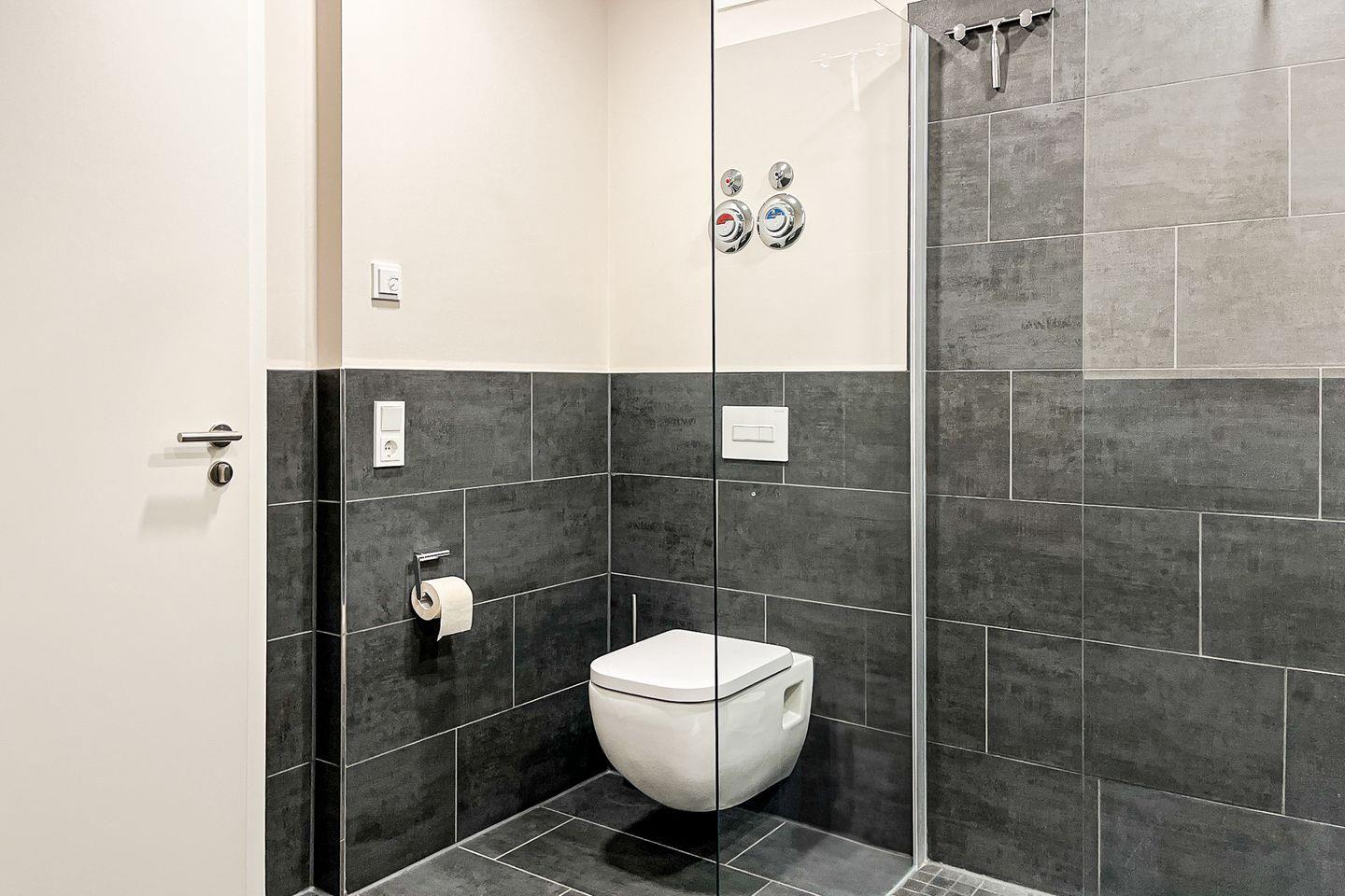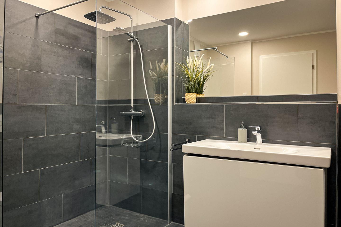 Das moderne Badezimmer ist mit einer bodengleichen Dusche, WC, Waschbecken, Kosmetikspiegel und Haartrockner ausgestattet – alles für einen angenehmen Start in den Tag.