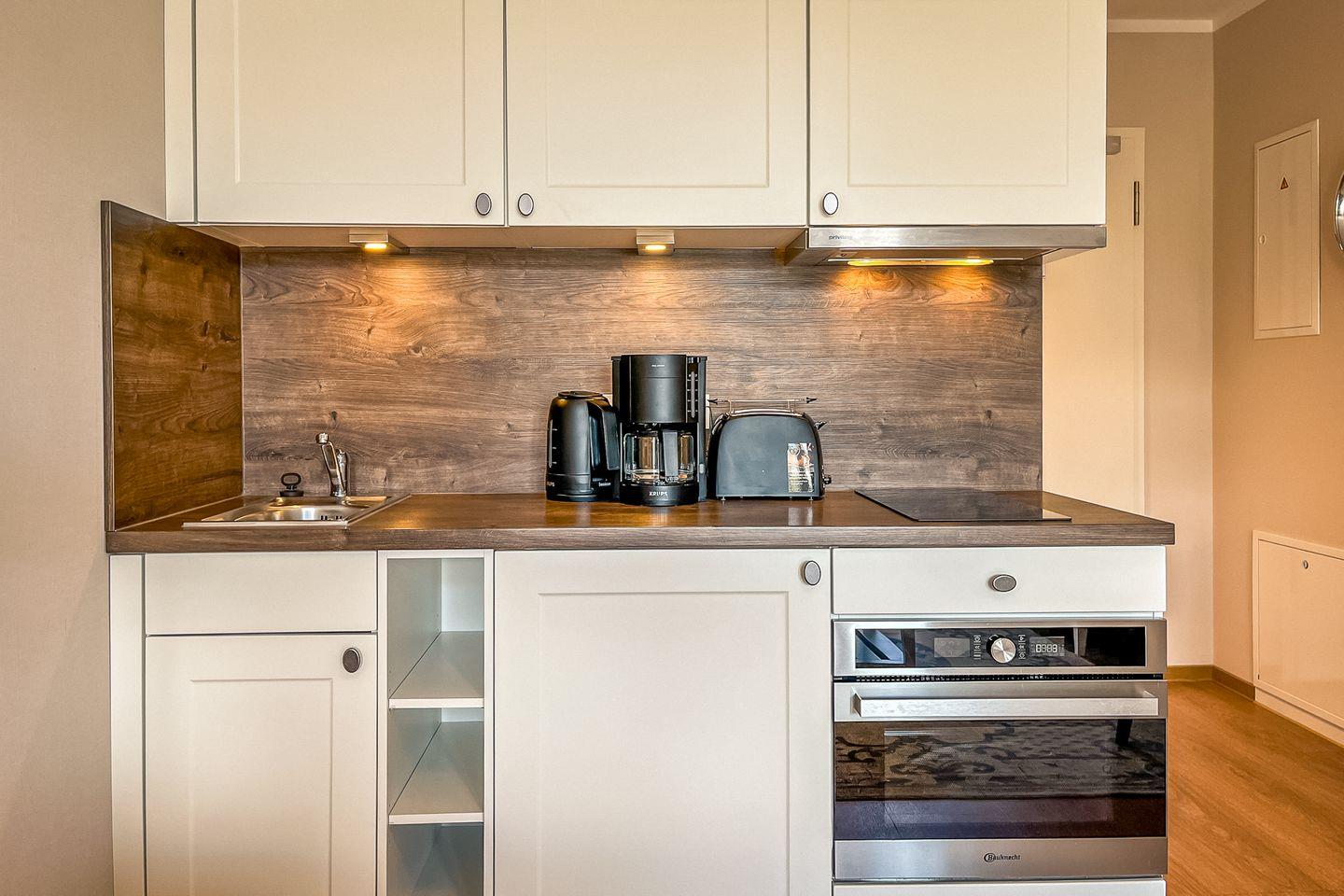 Die integrierte Küche ist mit allem ausgestattet, was Du für Deinen Aufenthalt benötigst: Cerankochfeld, Backofen, Kühlschrank mit Gefrierfach, Kaffeemaschine, Wasserkocher, Toaster sowie Kochutensilien und Geschirr.
