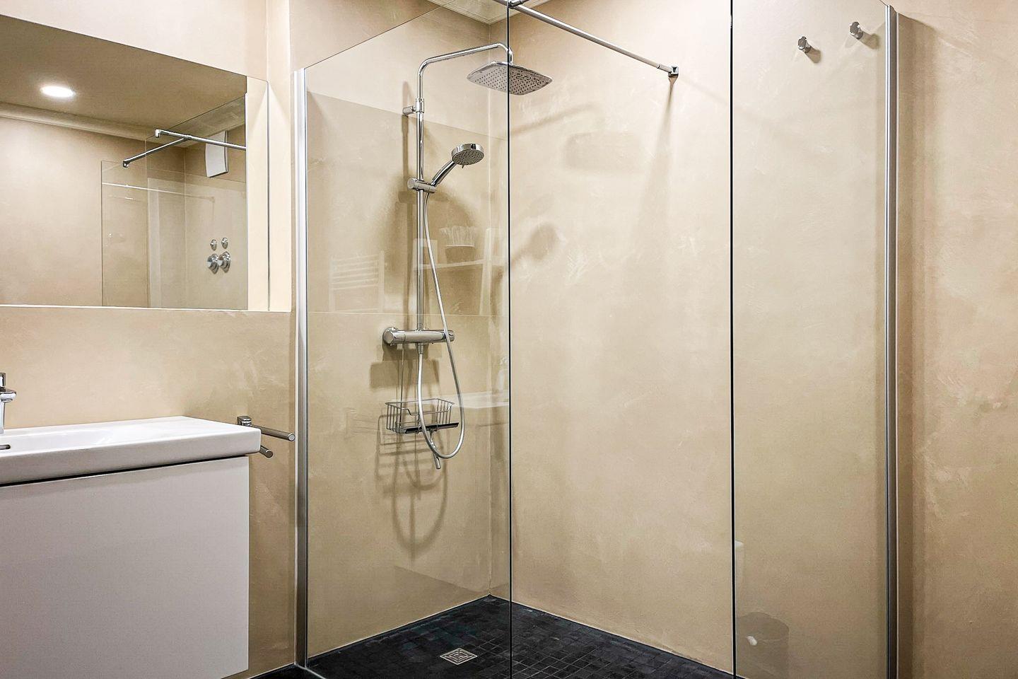 Das stilvolle Badezimmer ist mit einer bodengleichen Dusche, WC, Waschbecken, Kosmetikspiegel und Haartrockner ausgestattet – praktisch und modern zugleich.