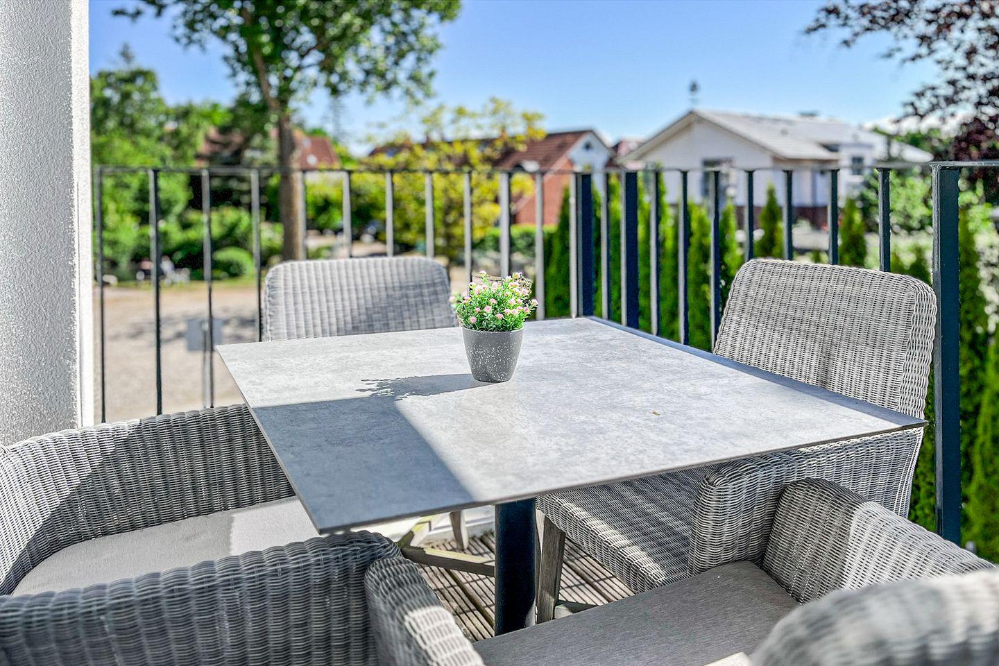 Ein besonderes Highlight ist der Balkon mit Gartenmöbeln und Sonnenschirm. Hier kannst Du wunderbar draußen sitzen und die klare Ostseeluft genießen – ob beim Frühstück oder beim Tagesausklang.
