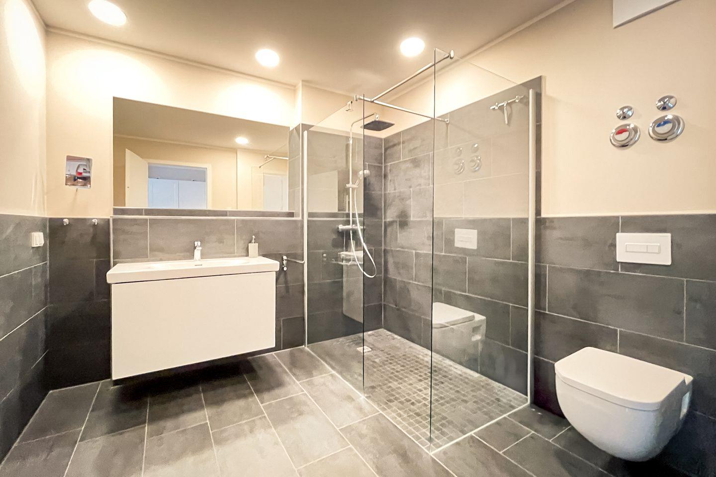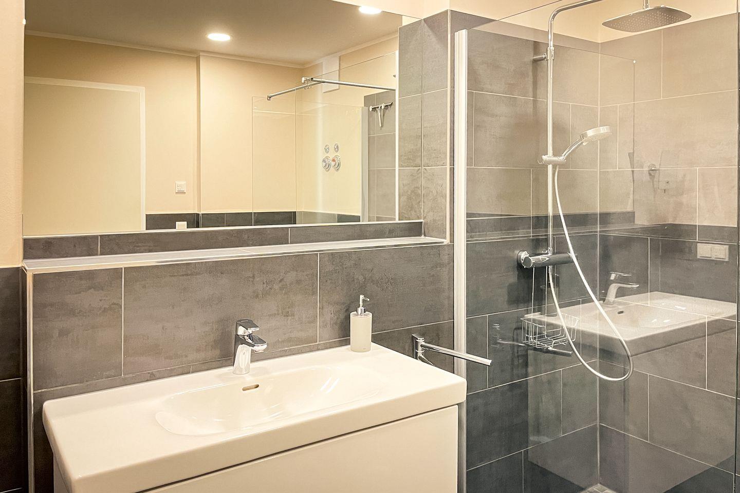 Das Badezimmer ist funktional und modern mit bodengleicher Dusche, WC, Waschbecken, Kosmetikspiegel und Haartrockner ausgestattet.