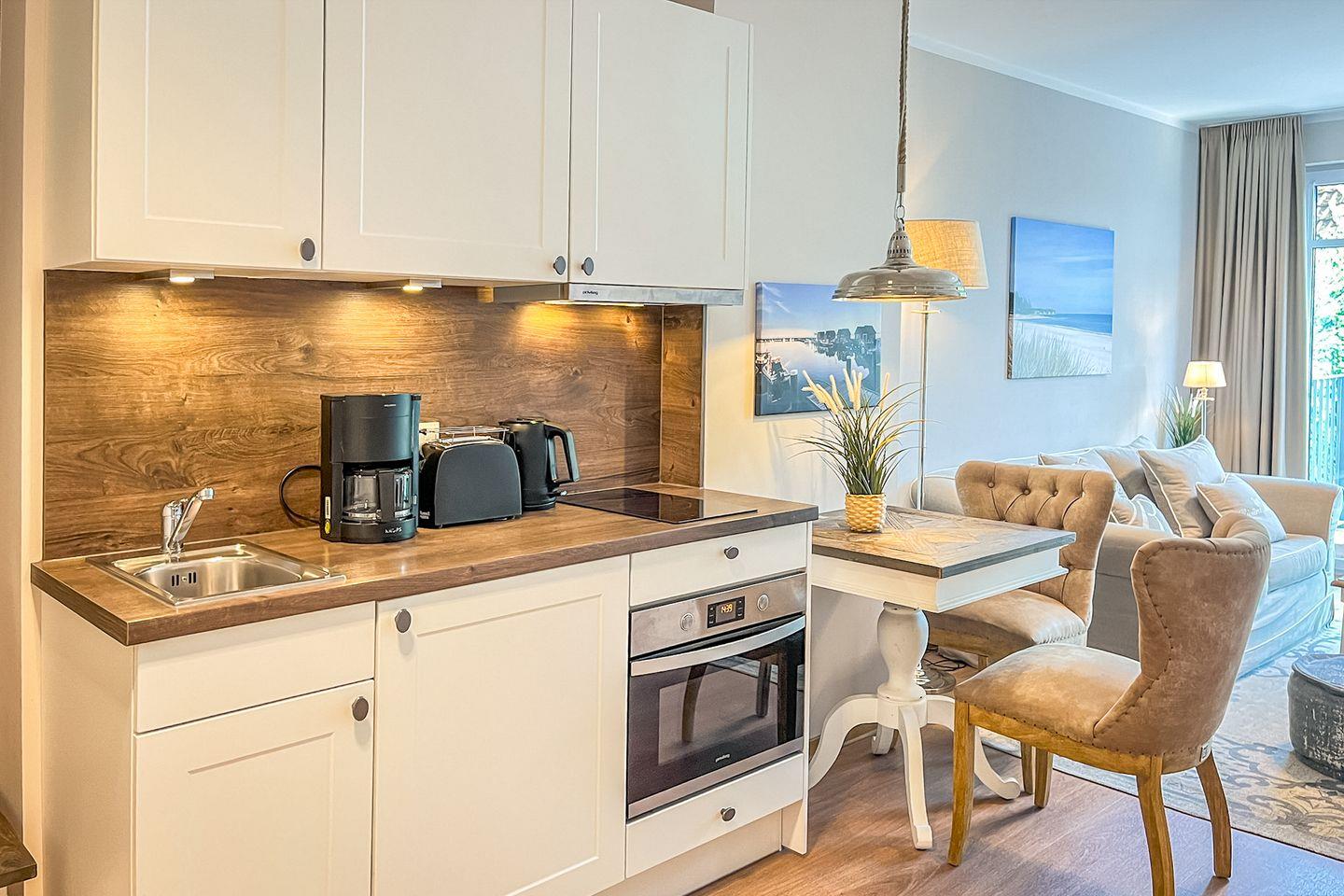 Die moderne Küchenzeile ist offen in den Wohnraum integriert und mit allem ausgestattet, was Du für Deinen Aufenthalt benötigst: Cerankochfeld, Backofen, Kühlschrank mit Gefrierfach, Kaffeemaschine, Wasserkocher, Toaster sowie Kochutensilien und Geschirr.