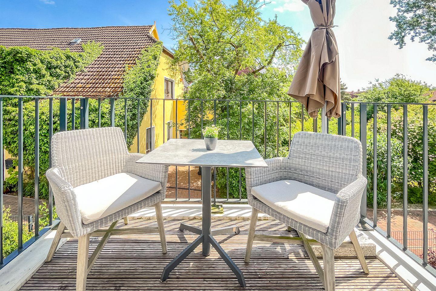 Ein möblierter Balkon mit Sonnenschirm lädt zu entspannten Momenten im Freien ein – sei es bei einer Tasse Kaffee am Morgen oder beim Lesen am Nachmittag.