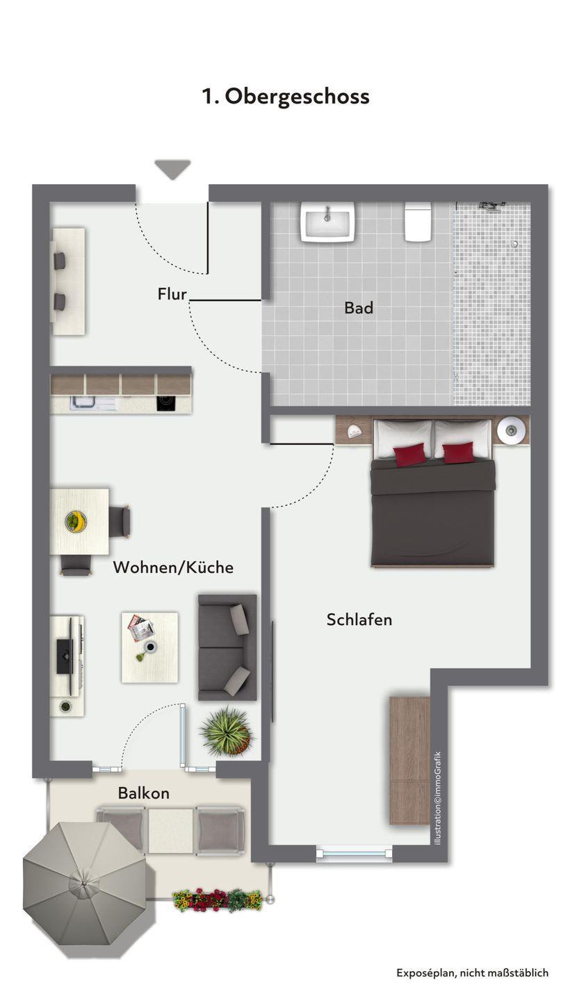 Ein weiteres Plus ist der Balkon mit Gartenmöbeln und Sonnenschirm – ein herrlicher Ort für das Frühstück im Freien oder ein Glas Wein am Abend.