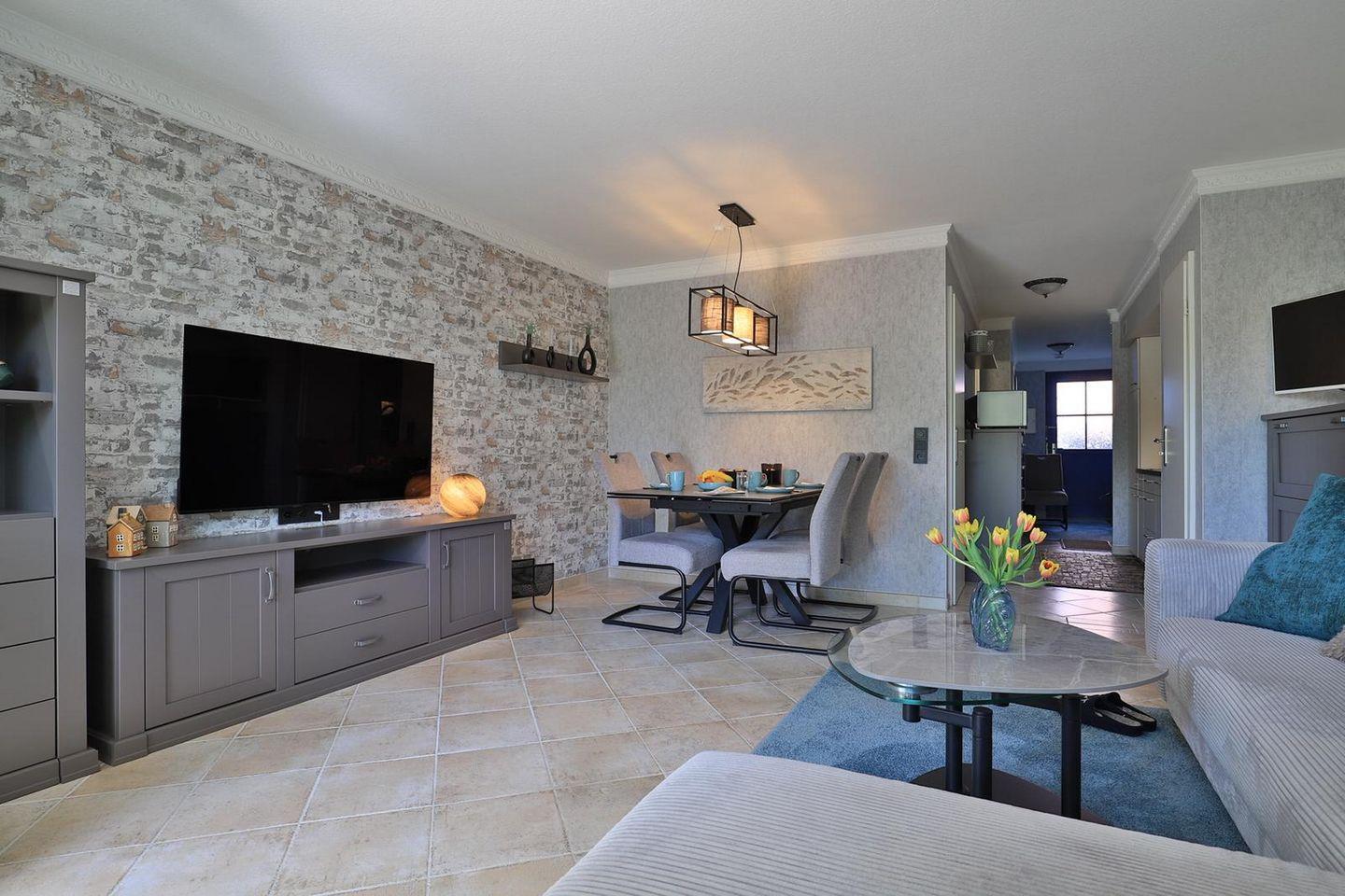 Die Küche ist offen in den Wohnraum integriert und verfügt über eine moderne und vollständige Ausstattung: Neben einem 2-Platten-Ceranherd, Kühlschrank mit Gefrierfach, Spülmaschine, Mikrowelle, Wasserkocher, Toaster, Kaffeemaschine sowie ausreichend Geschirr und Besteck findest du alle notwendigen Küchenutensilien vor, sodass die Zubereitung kleiner und großer Mahlzeiten jederzeit möglich ist. Das Wohnzimmer ist mit Fliesen und einem Teppich ausgestattet. Ein praktischer Essbereich mit Esstisch schafft ausreichend Platz für gemeinsame Mahlzeiten.