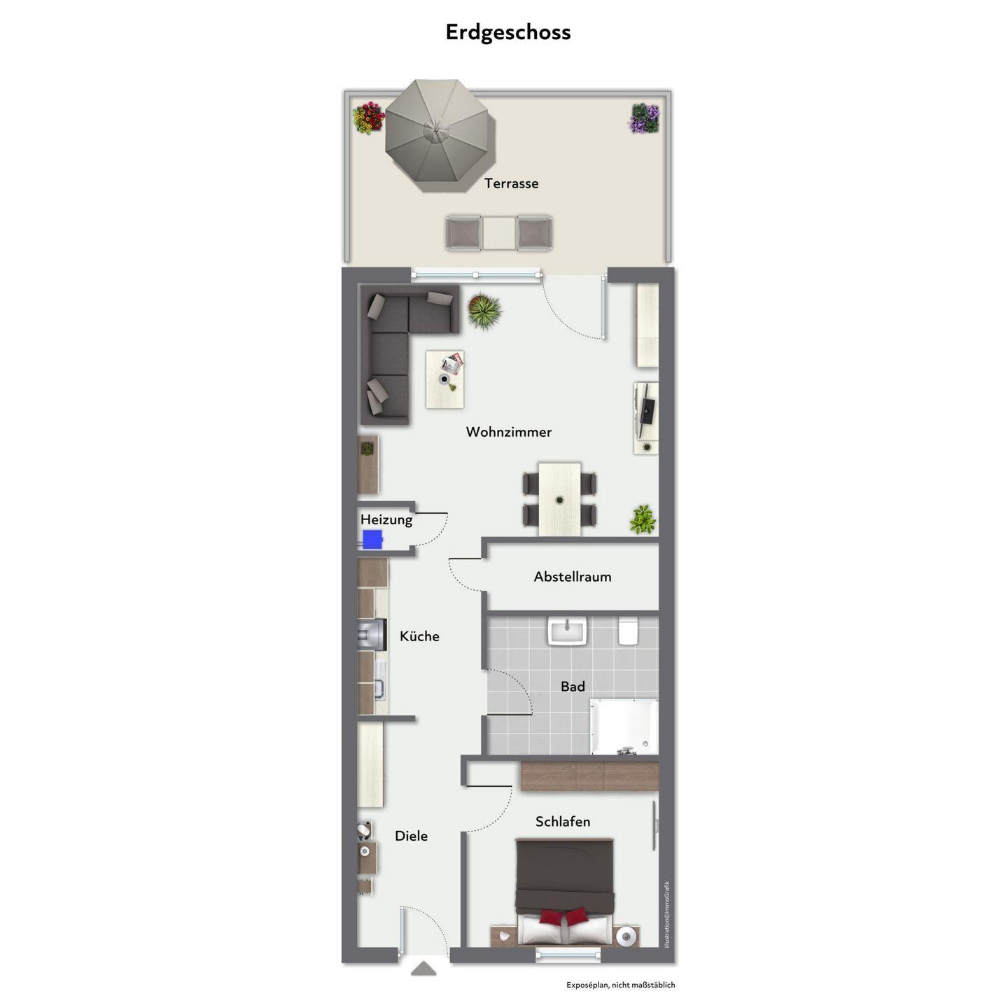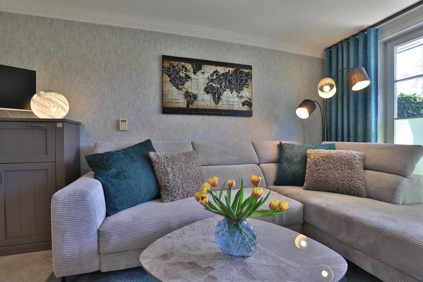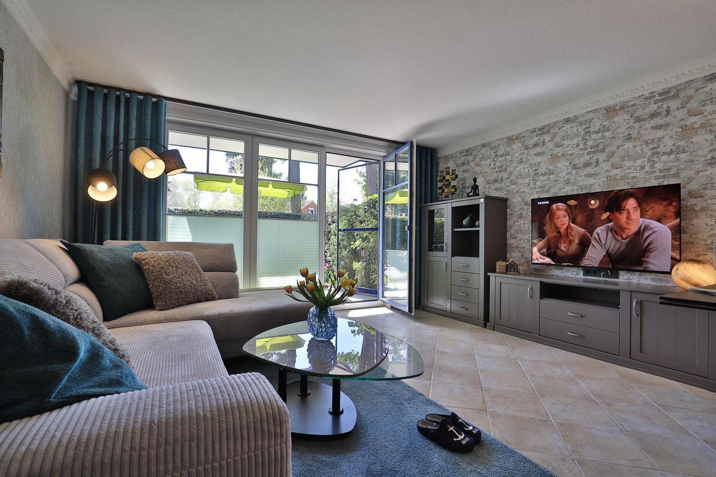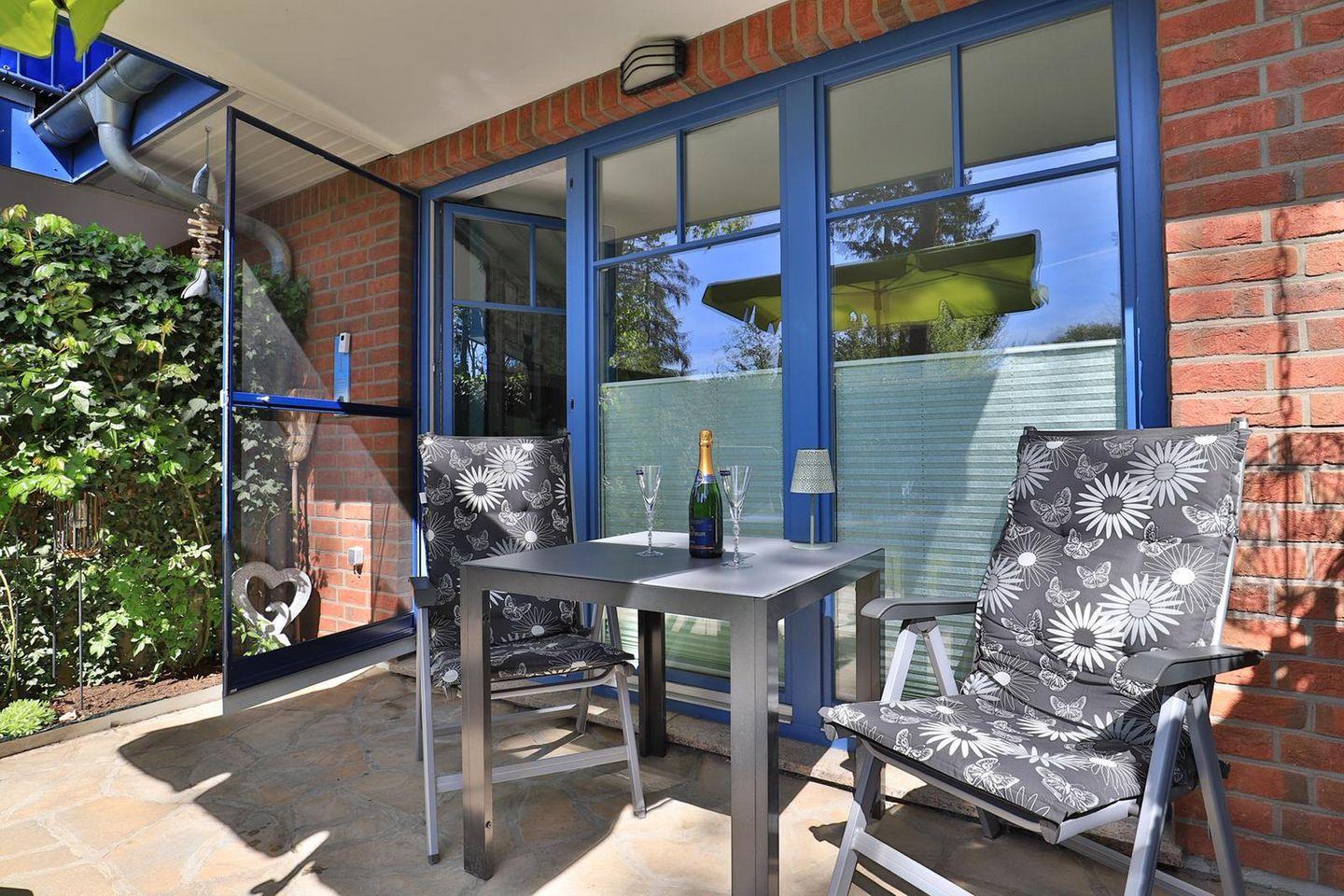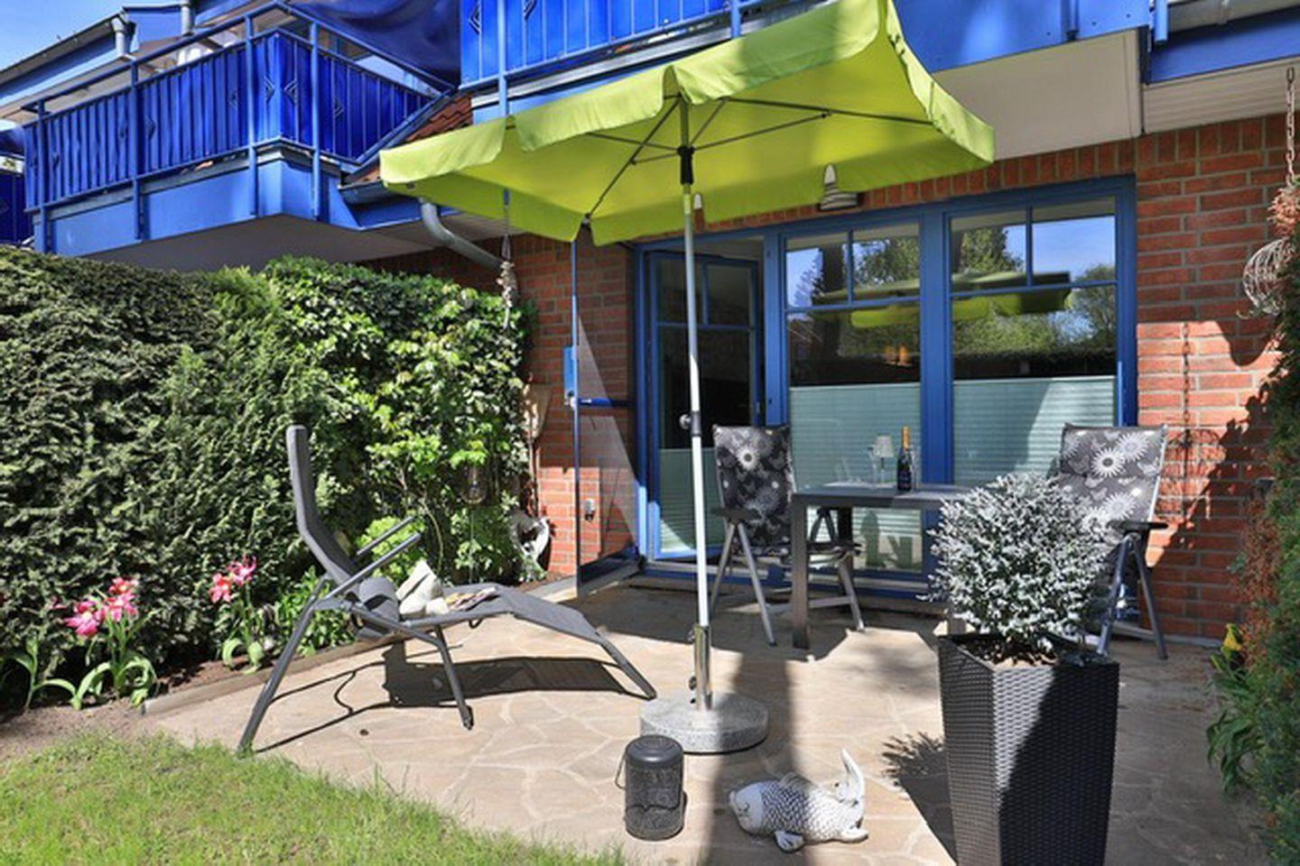 Das Wohnzimmer bietet durch das komfortable Sofa und die wohnliche Atmosphäre einen idealen Rückzugsort für erholsame Stunden. Für entspannte Fernsehabende ist ein Flachbild-TV, ergänzt durch einen CD-Spieler und ein Radio, vorhanden. Die mit Hecke umgebene Terrasse lädt zum entspannten Aufenthalt im Freien ein. Terrassenmöbel mit Sonnenschirm stehen zur Nutzung bereit.