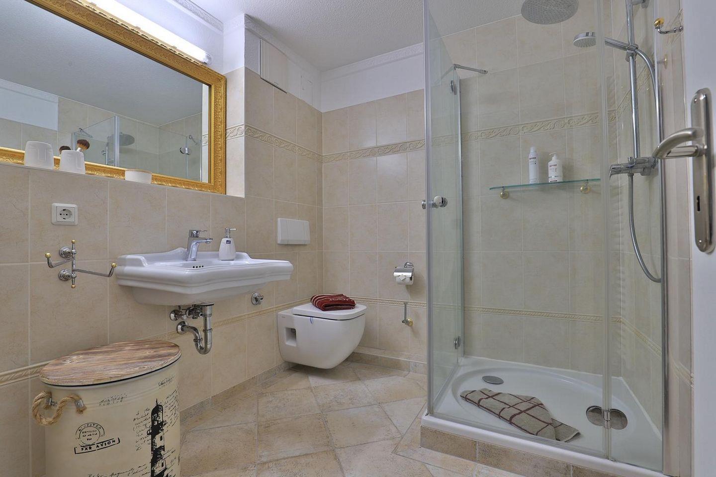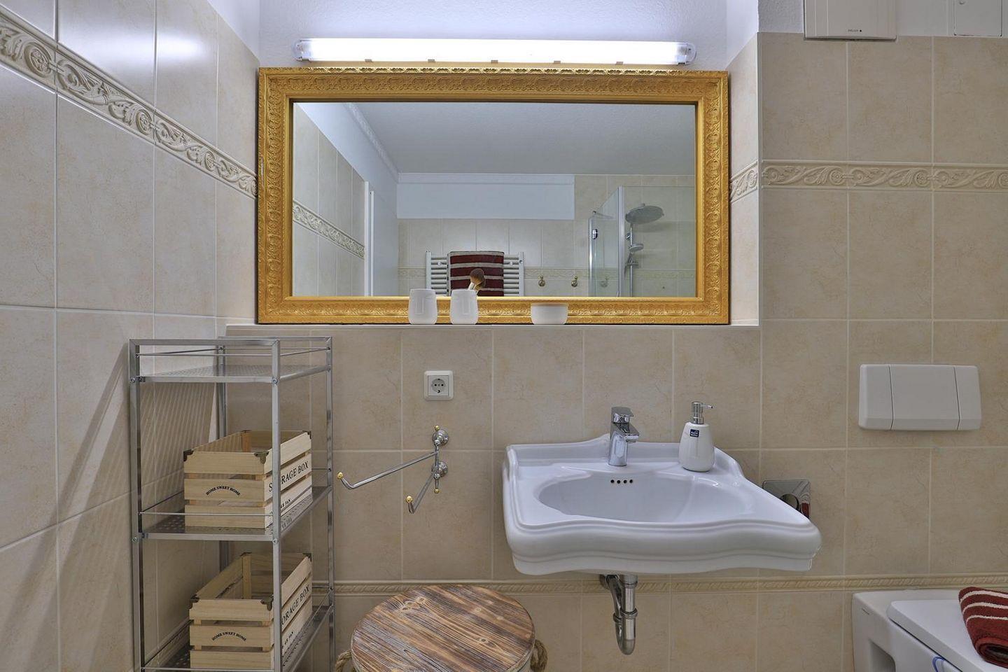 Das Badezimmer ist mit einer Dusche, sowie WC, Waschbecken, Spiegel und Haartrockner ausgestattet.