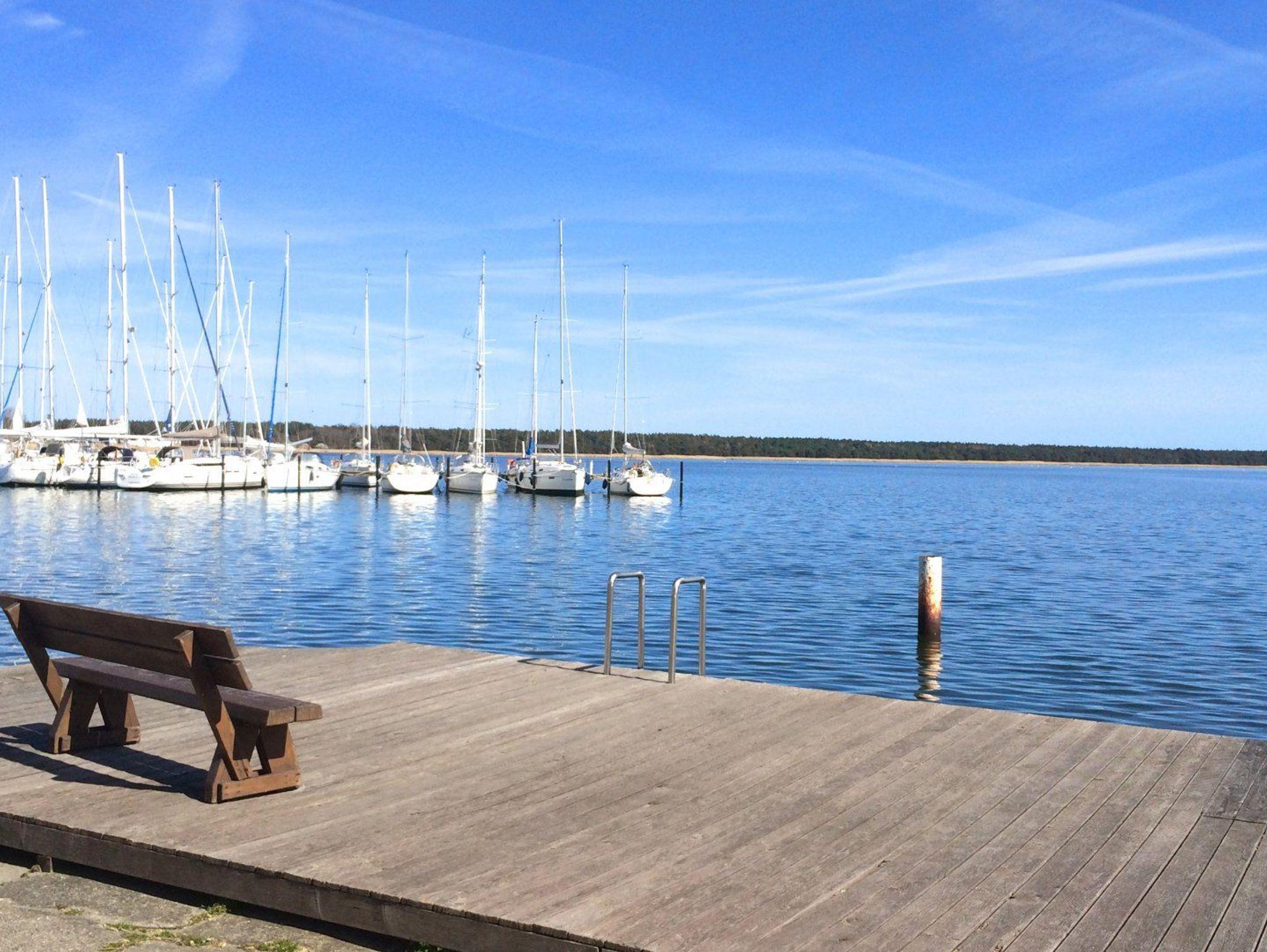 Unsere Ferienwohnung Hafenglück in Breege mit Blick auf den idyllischen Breeger Hafen bietet ein Schlafzimmer mit Doppelbett und zwei weitere Schlafgelegenheiten im Wohnzimmer (Schlafcouch). In den Wohnbereich ist eine komplett ausgestattete Küche mit Essbereich integriert. Von der anschließenden, geschützt liegenden Terrasse wird der Blick auf den Breeger Bodden und den kleinen Hafen frei. Im Bad befindet sich eine Dusche. Die Wohnung verfügt über einen Stellplatz und Fahrradparkplätze.