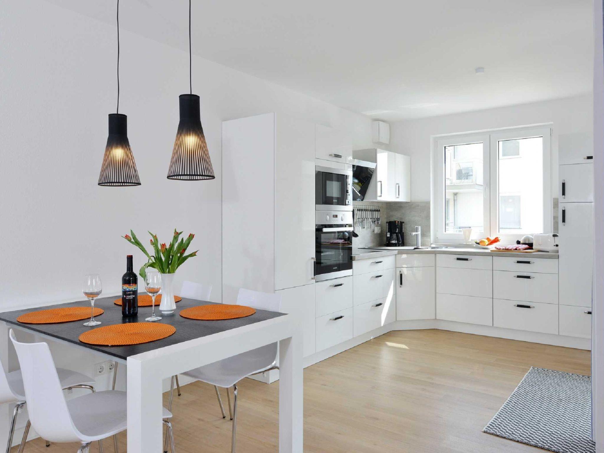 Küche mit Backofen, Mikrowelle, Spülmaschine, Kühlschrank mit Gefrierfach