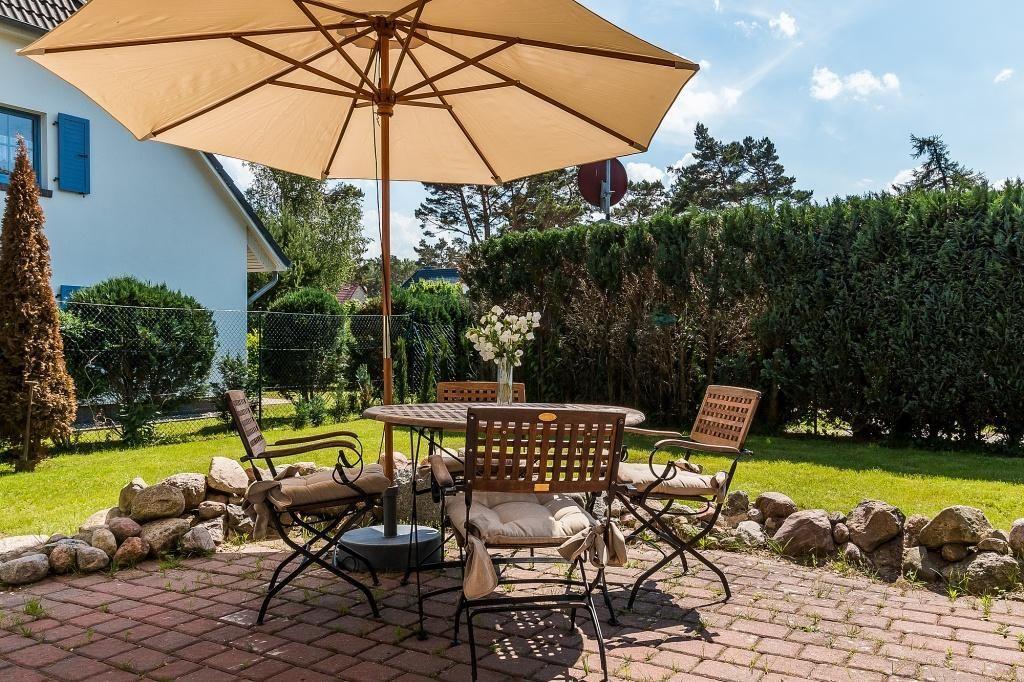 Im Außenbereich steht dir eine Holzdeck-Terrasse mit passender Bestuhlung und Sonnenschirm zur Verfügung. Dank der Heckenbepflanzung ist die Terrasse nicht einsehbar. Hier kannst du deine Ruhe und Privatsphäre genießen - so wie man es sich im Urlaub wünscht. Zudem gehört ein PKW-Stellplatz zur Ferienwohnung dazu.
