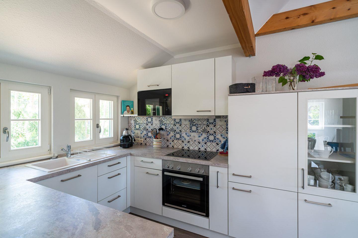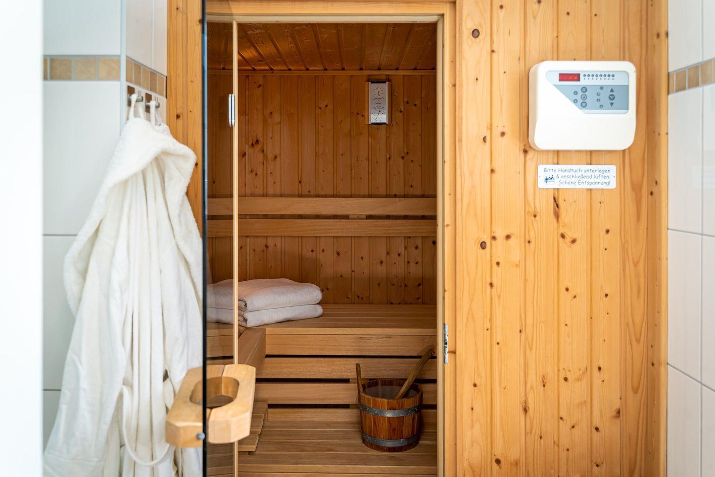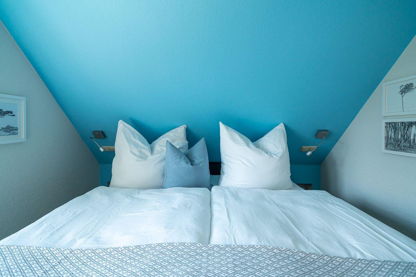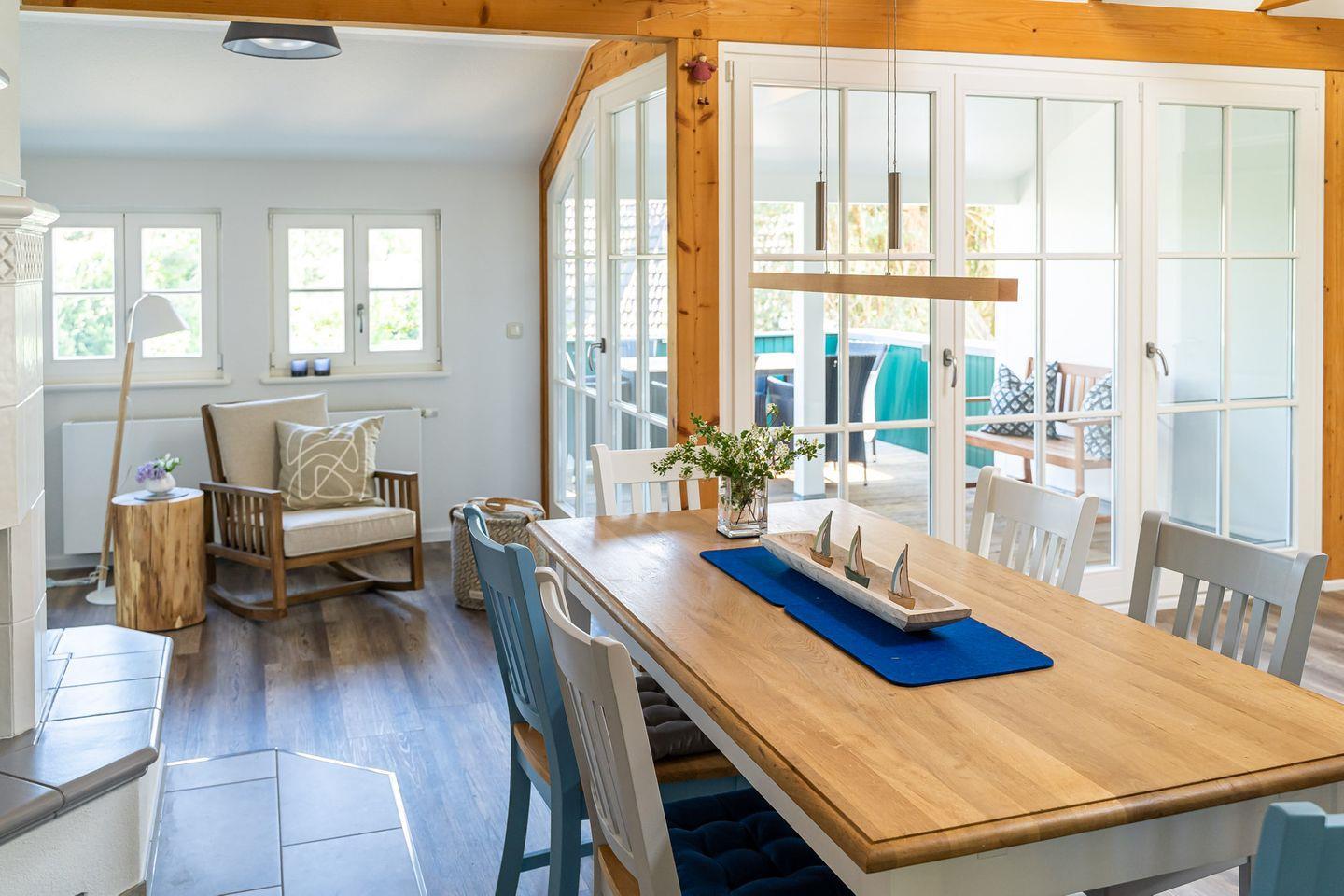 Vom Interieur, über Kunst- und Deko-Elemente bis ins kleinste Detail wurde in der Ferienwohnung „Gelassenheit“ alles liebevoll und ausgesucht eingerichtet. Entstanden ist ein modernes Beachhouse-Flair, das sich perfekt an seine Strandumgebung anpasst. Über eine große Holzterrasse geht’s in den Eingang. Im Erdgeschoss befindet sich das erste der drei Schlafzimmer. Großzügig gestaltet, mit hochwertigem Boxspringbett und Strandbildern, die zum Träumen einladen. Die hauseigene Sauna mit angeschlossenem Bad geht ebenfalls vom Flur ab. Gerade nach einem stürmischen Strandspaziergang ist die wohltuende Wärme das i-Tüpfelchen für eine erholsamen Tag. Über die Holztreppe gelangst du in den offenen Wohnbereich. Mit der gemütlichen Couch, der modernen Küche, dem großen Esstisch am Kaminofen und dem Schaukelstuhl spielt sich hier das Urlaubsleben ab. Ein weiteres Highlight ist die großzügige und teils überdachte Dachterrasse (18 qm), die Dank heimischer Bäume, Sträucher und niedlichen Reetdächern das ganze Jahr über einen wundervollen Ausblick bietet. Zwei stilvolle Schlafzimmer mit komfortablen Boxspringbetten, eins mit Bad en Suite sowie ein weiteres Badezimmer runden den Wohnkomfort für bis zu sechs Personen perfekt ab.