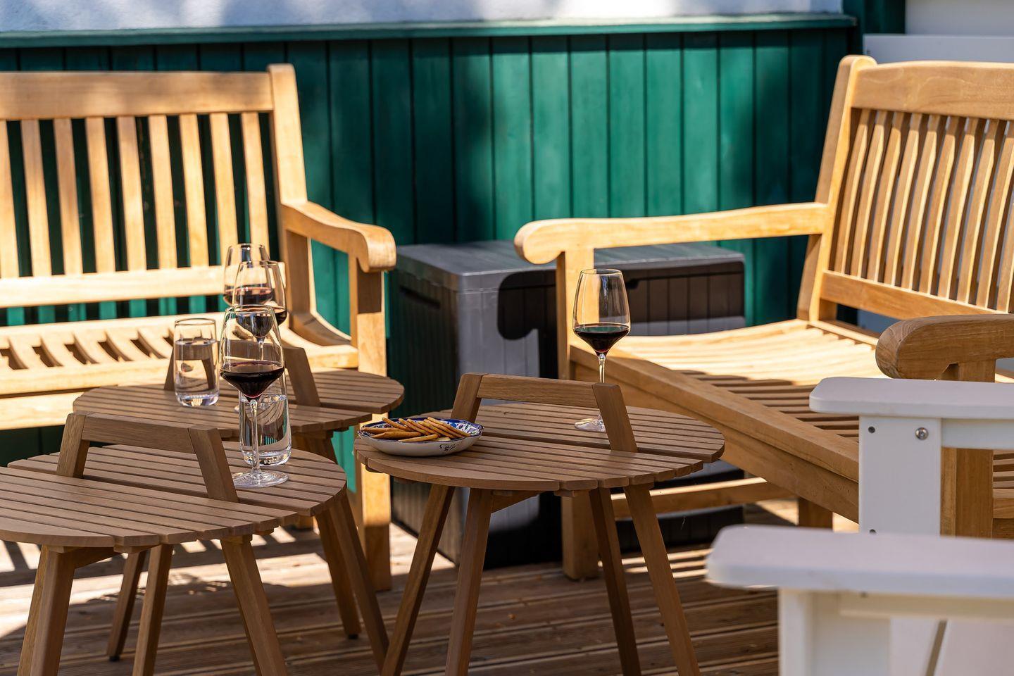 Der Außenbereich hält eine großzügige Holzterrasse (50 qm) mit Liegestühlen, Sonnenschirm und kleinen Garten bereit. Nach einem ausgiebigen Urlaubstag kann man hier ganz privat für sich entspannen - unter freiem Himmel, im Hintergrund das sanfte Murmeln des Meeres und mit Blick in die grüne Umgebung, in der vielleicht gerade ein Reh vorbeizieht.