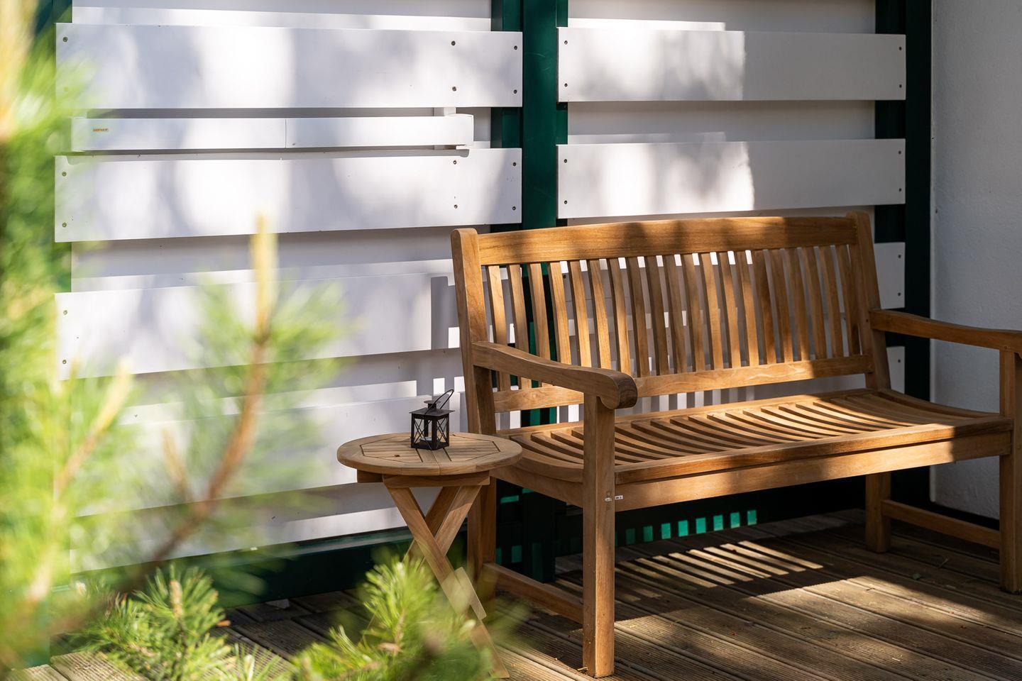 Der Außenbereich hält eine großzügige Holzterrasse mit Liegestühlen, Sonnenschirm und kleinen Garten bereit. Nach einem ausgiebigen Urlaubstag kann man hier ganz privat für sich entspannen - unter freiem Himmel, im Hintergrund das sanfte Murmeln des Meeres und mit Blick in die grüne Umgebung, in der vielleicht gerade ein Reh vorbeizieht.