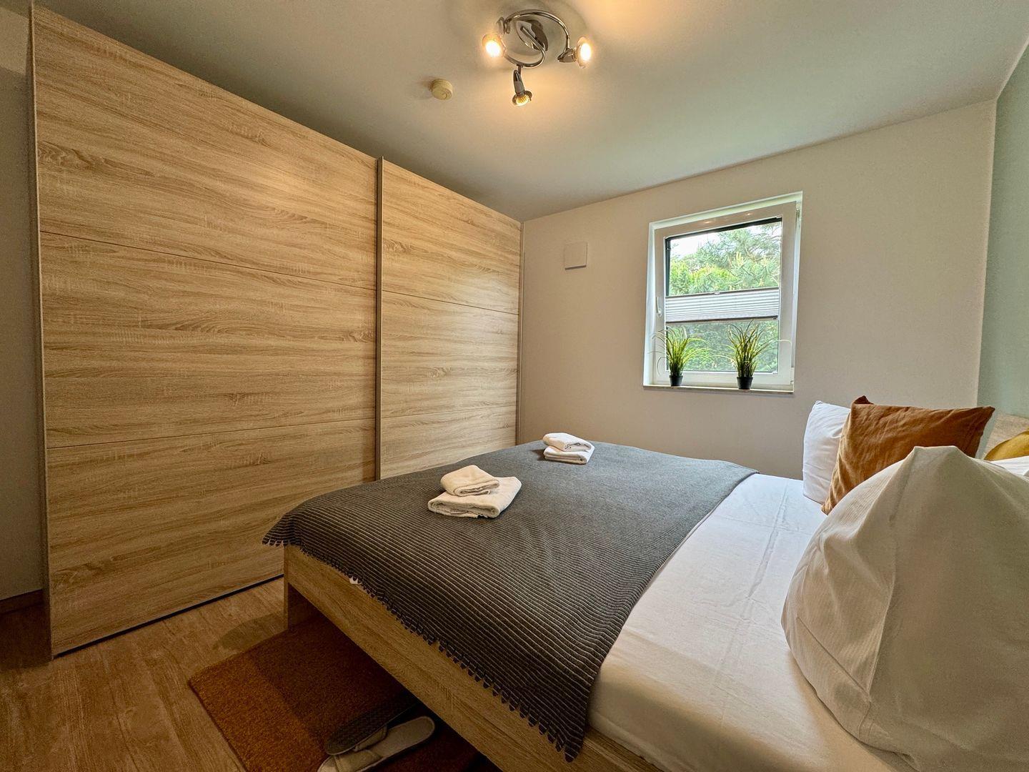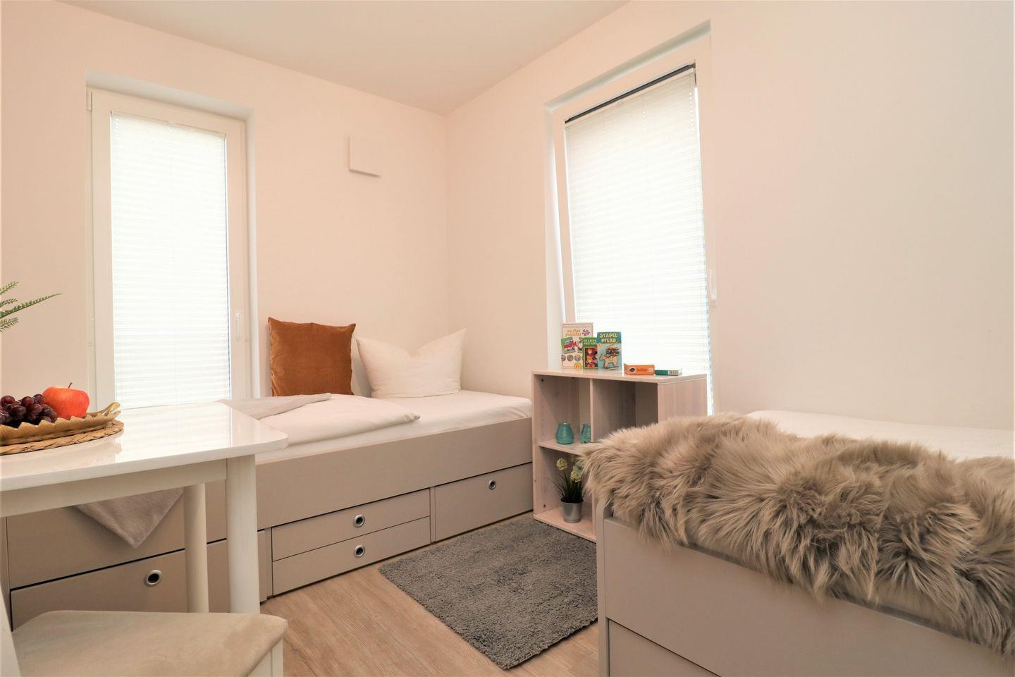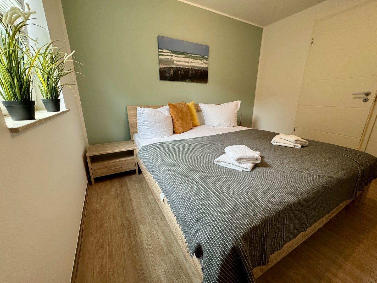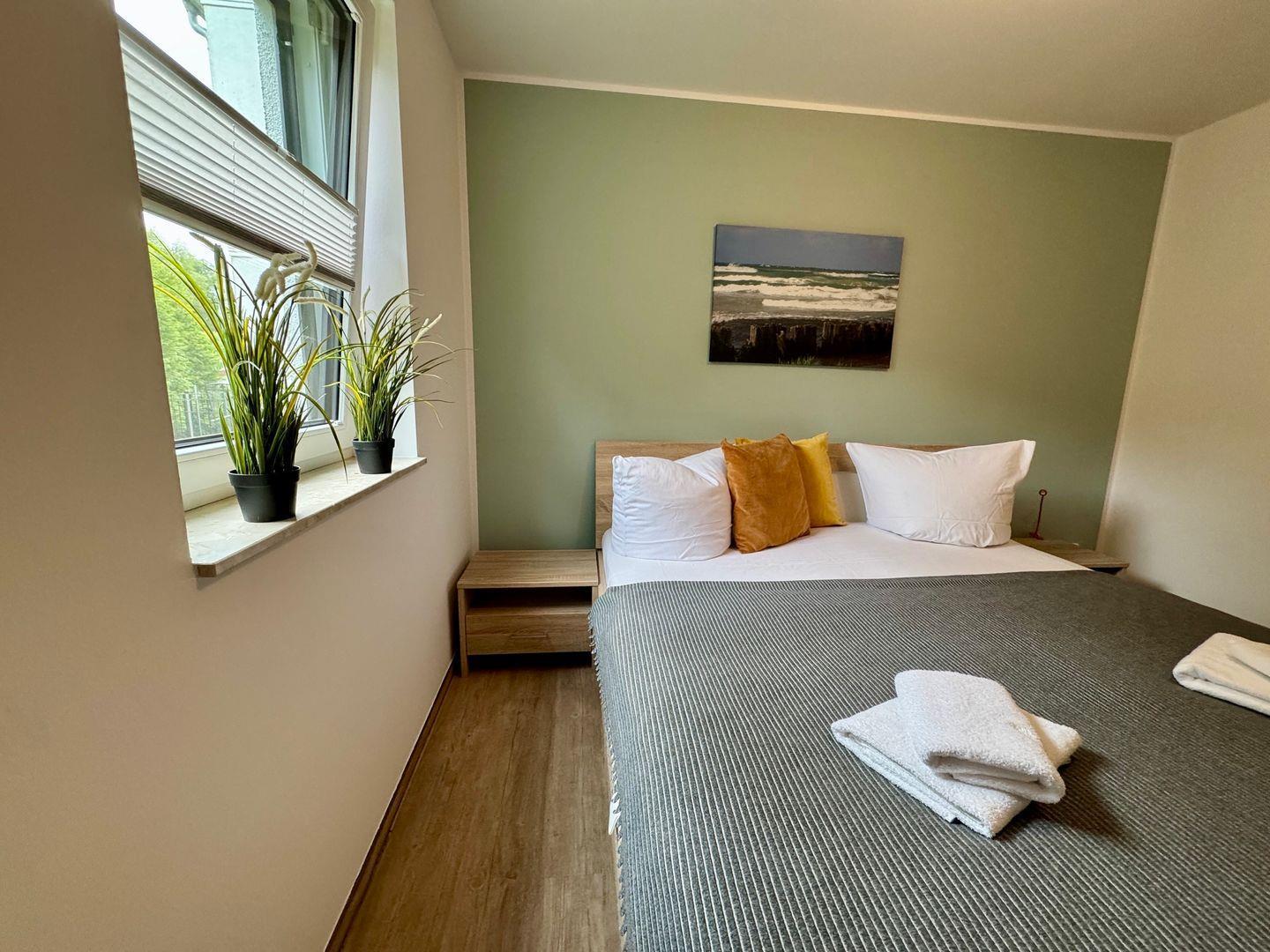 Ein geräumiges Appartement im Hochparterre, dass Platz für max. 5 Personen bietet. Es verfügt über zwei Balkone – einen nach Südwesten und einen nach Norden ausgerichtet, die Ihnen zu verschiedenen Tageszeiten Sonne bieten. Im Wohnzimmer befindet sich eine Schlafcouch für 1 Person sowie eine offene Küche. Es gibt ein Schlafzimmer mit gemütlichem Doppelbett und ein weiteres Schlafzimmer mit 2 Einzelbetten. Das Badezimmer ist mit Dusche und WC ausgestattet. Haustiere sind erlaubt, jedoch ist das Rauchen nicht gestattet. WLAN steht zur Verfügung, und ein Parkplatz in der Tiefgarage sorgt für bequemes Parken. Zusätzlich können Fahrräder im Keller sicher abgestellt werden.