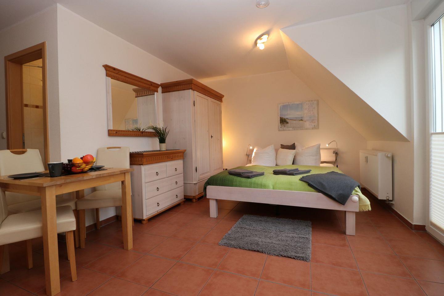 Dieses gemütliche Einraumappartement im 1. Obergeschoss bietet auf ca. 12 m² Platz für bis zu 2 Personen. Der Wohn-Schlafraum ist mit einer Küchenzeile ausgestattet, die einen Kühlschrank ohne Gefrierfach umfasst. Das Bad verfügt über eine Dusche und ein WC. Außenrollos sorgen für angenehmen Schatten und Privatsphäre. Ein 12 m² großer Südbalkon lädt dazu ein, die Sonne zu genießen und entspannte Stunden zu verbringen. Der PKW-Stellplatz befindet sich direkt am Haus und ist durch eine Schranke gesichert. Haustiere sind willkommen, jedoch ist das Rauchen im Appartement nicht gestattet.