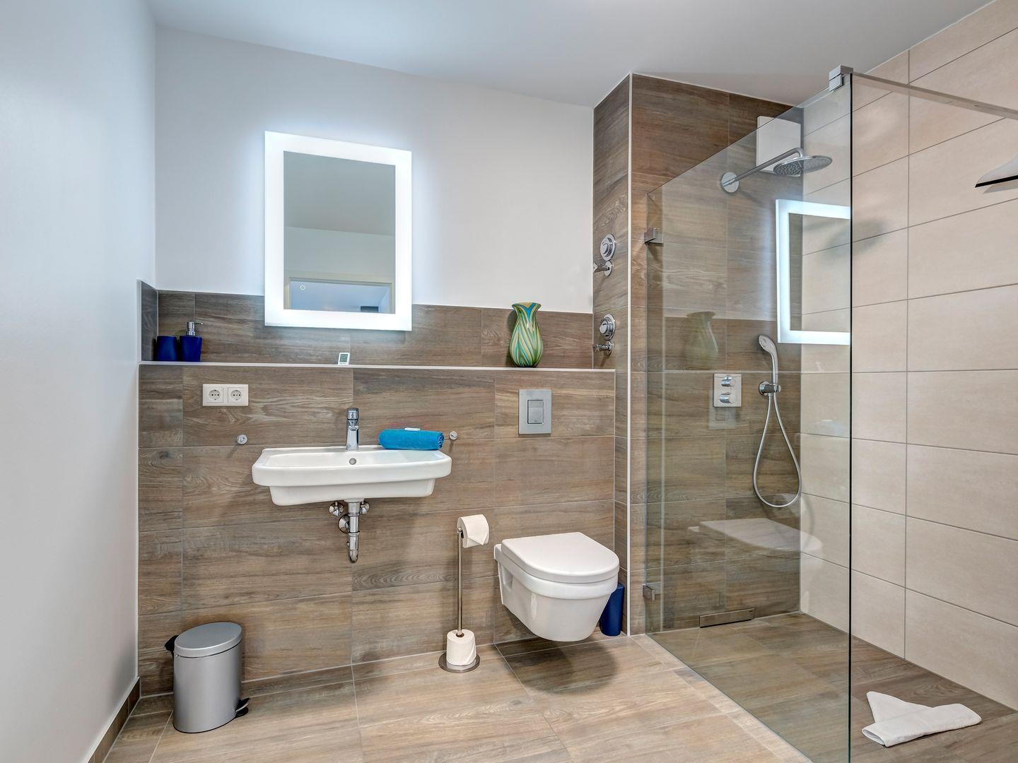Das Schlafzimmer lockt mit einem komfortablen Boxspringbett für erholsame Nächte zu zweit. Das Badezimmer ist modern gestaltet, mit einer geräumigen Dusche.