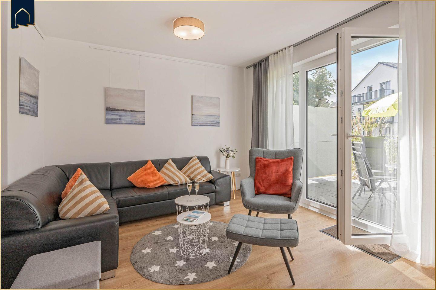 Im Wohnzimmer erwartet Sie eine gemütliche Sofaecke mit TV (2 Fernseher im Haus), ideal für entspannte Abende. WLAN ist im gesamten Haus kostenfrei verfügbar. Das moderne Raumkonzept mit vielen Fenstern sorgt für helle, freundliche Räume und einen angenehmen Blick ins Grüne.
