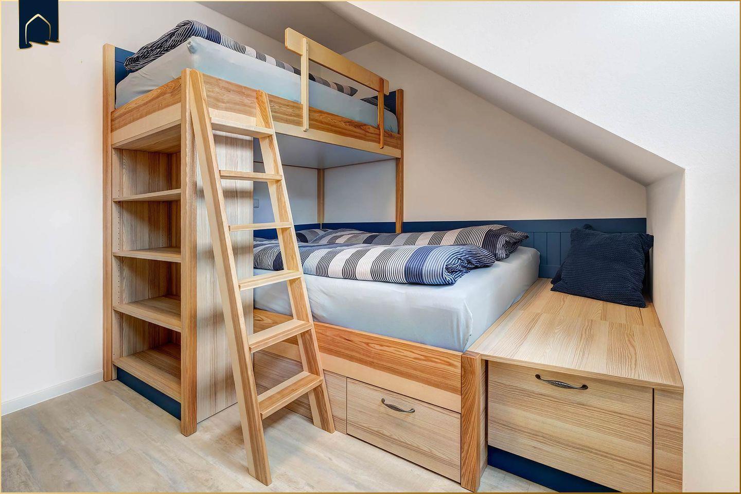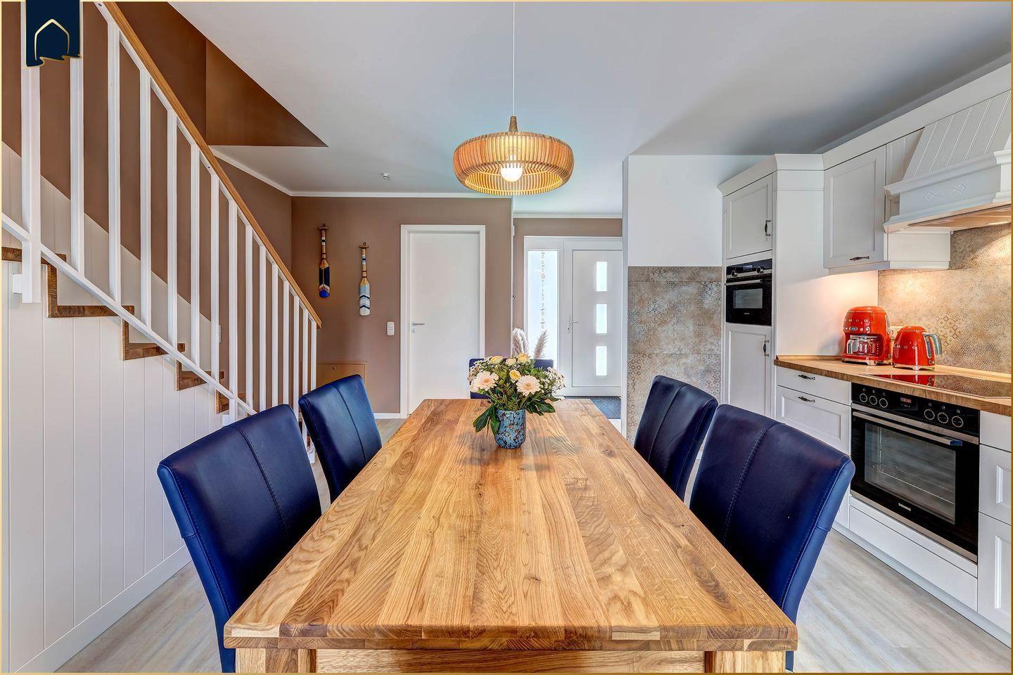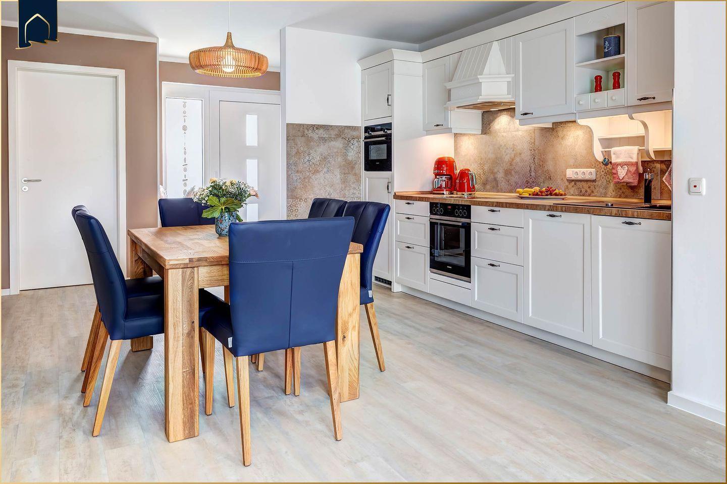 Die offene Küche lässt keine Wünsche offen: Spülmaschine, Mikrowelle, Kühlschrank mit Gefrierfach, Backofen, Herd, Toaster, Wasserkocher und Kaffeemaschine stehen bereit. Auch an Küchenutensilien, Geschirr und Besteck wurde gedacht. Wer im Urlaub gerne kocht oder gemeinsam isst, findet im offenen Wohn- und Essbereich viel Platz dafür. Zusätzlich punktet das Ferienhaus mit einem Schreibtisch und gutem WLAN – ideal für Workation oder gelegentliche Arbeit unterwegs. Ein privater Parkplatz gehört ebenso zur Ausstattung wie TV in beiden Schlafzimmern, Bücher, Spiele, Fußbodenheizung, Fliegengitter und vieles mehr.