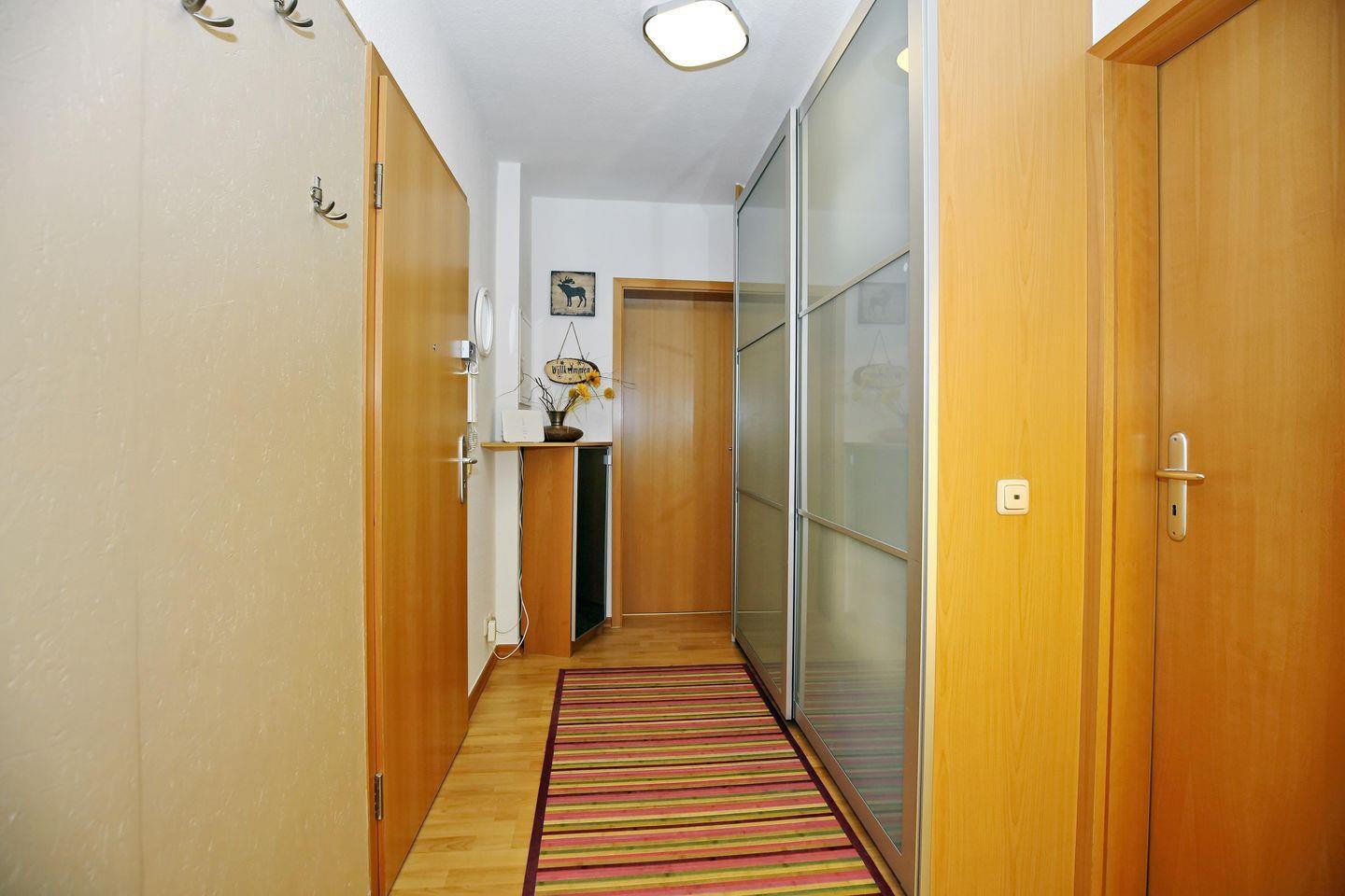 Das Tageslichtbad ist mit einer Badewanne mit Wannengriff, einem WC und einer Waschmaschine ausgestattet. Ebenso findest du einen Spiegel, ein Regal und einen Handtuchheizkörper vor. An den Fenstern sind Rollos als Sichtschutz angebracht. Das Bad und der Küchenbereich sind gefliest. Im Wohn- und Essbereich, im Flur sowie im Schlafzimmer ist Laminat verlegt.