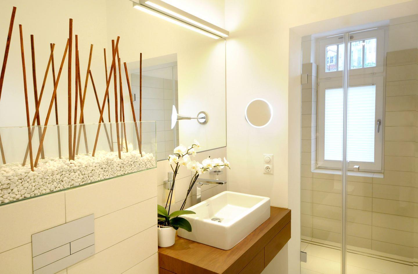 Beide Tageslichtbäder sind hell und modern gestaltet. Jedes Bad verfügt über eine ebenerdige Dusche, ein WC, einen Waschtisch mit Waschbecken, einen großen beleuchteten Spiegel sowie einen Kosmetikspiegel und einen Föhn. Ein Badezimmer ist über den Flur zugänglich, das zweite Badezimmer ist vom ersten Schlafzimmer aus begehbar. Beide Bäder sind gefliest.