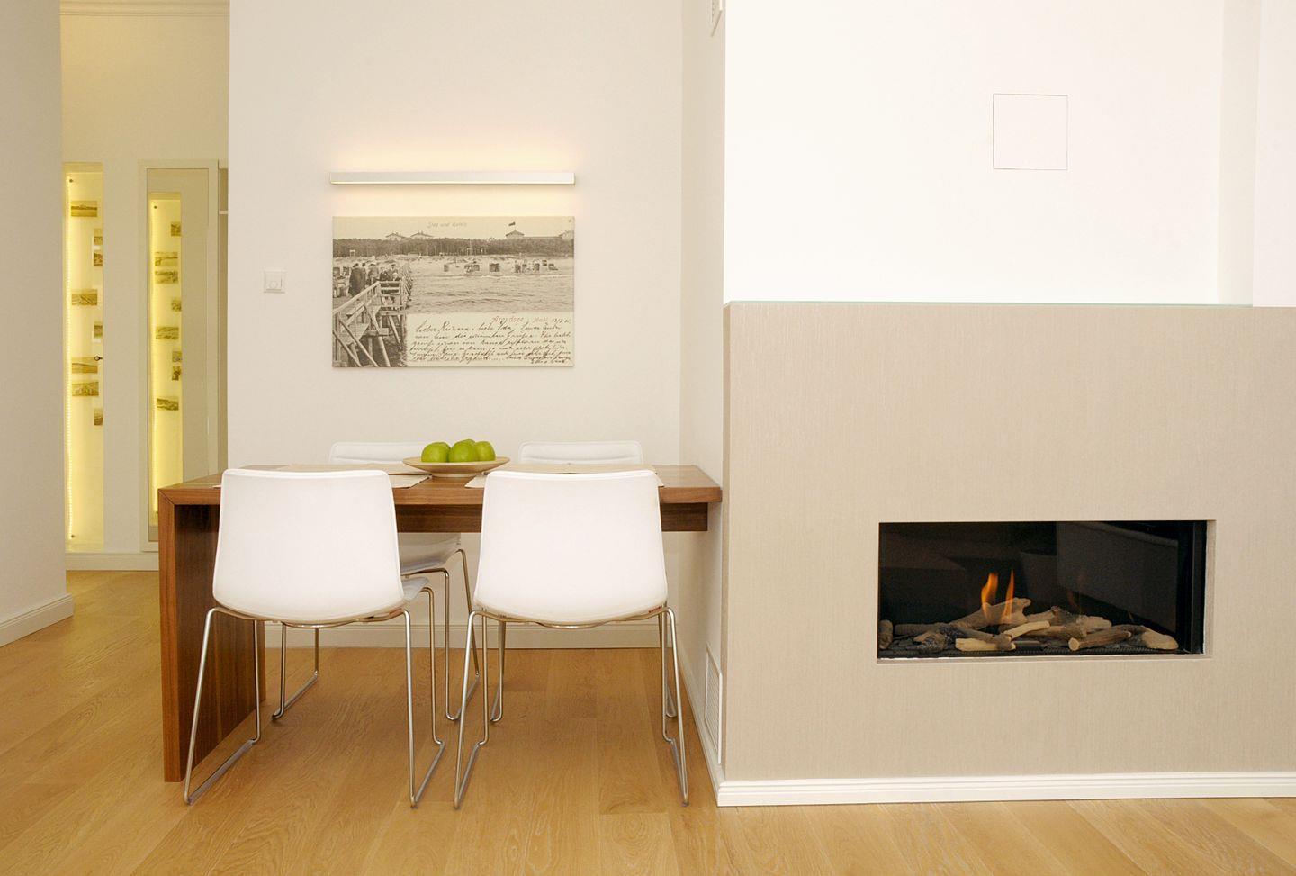 Der stilvolle Wohnbereich der Ferienwohnung lädt dich mit einer gemütlichen Couch und einem Sessel zu geselligen Abendstunden ein. Beste Unterhaltung garantieren dir ein großer Flachbild-TV mit Blu-ray Disc-/DVD-Player sowie eine Dockingstation. Der Dekokamin (ohne Funktion) trägt zur gemütlichen Atmosphäre des Wohnbereichs bei. Der angrenzende Essbereich bietet dir genügend Platz für deine gemeinsamen Mahlzeiten.