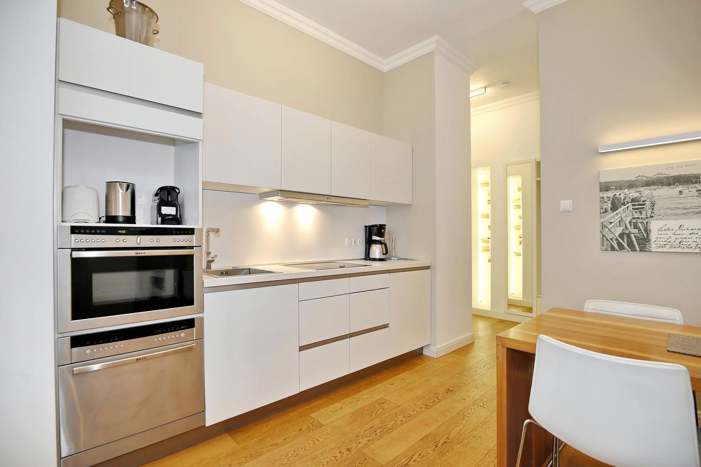 Die moderne Küchenzeile ist für dich mit einem 4-Zonen-Cerankochfeld, einem Backofen, einer Mikrowelle, einem Geschirrspüler sowie einem Kühlschrank mit Gefrierfach voll ausgestattet. Technische Kleingeräte, wie ein Wasserkocher, ein Toaster, eine Kaffeemaschine sowie eine Nespressomaschine von De Longhi komplettieren die offene Küche.