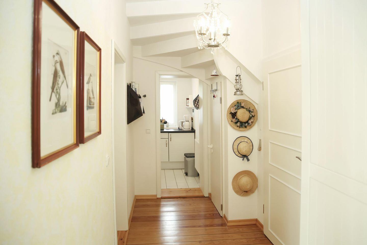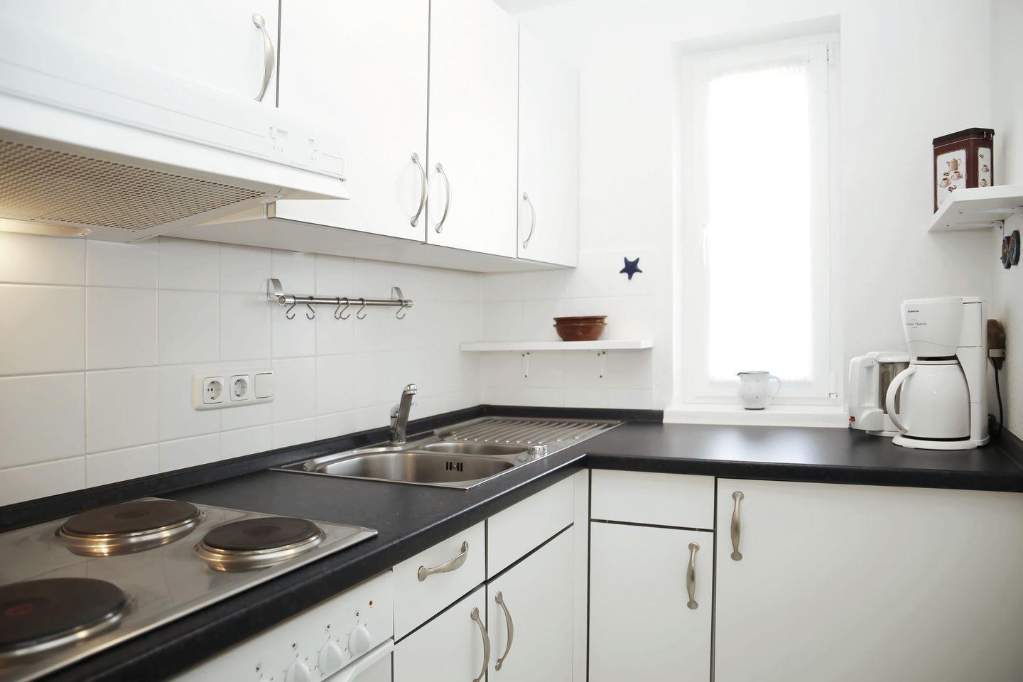 Die charmant eingerichtete Ferienwohnung liegt im ersten Obergeschoss. Auf 50 m² erwartet dich ein Wohnzimmer mit gemütlicher Essecke, ein Schlafzimmer, ein Duschbad und eine kleine separate Küche. Der Strand liegt ca. 300 m entfernt.