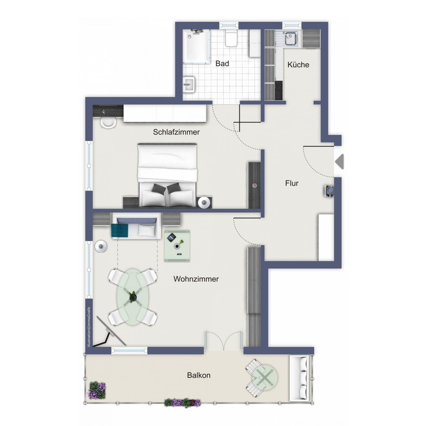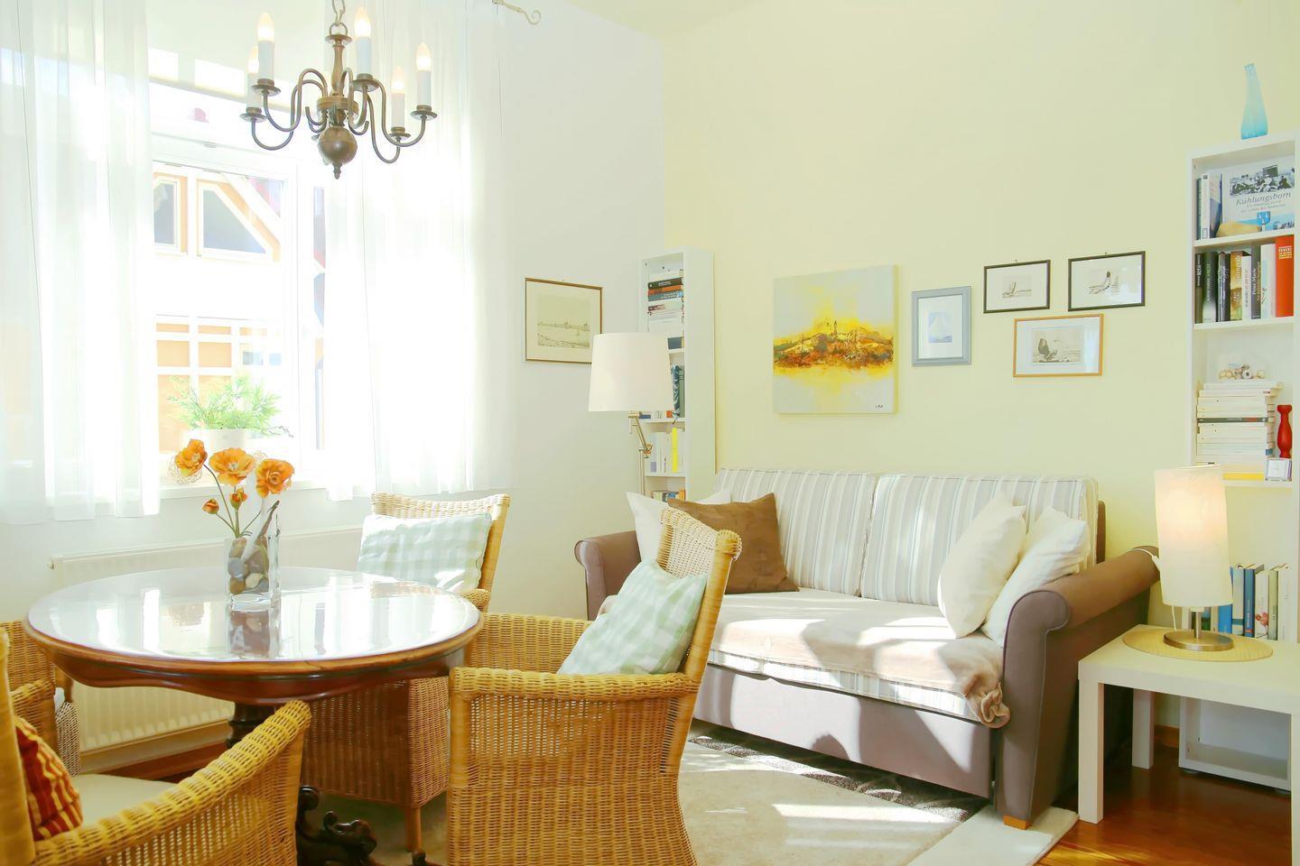 Das liebevoll ausgestattete Wohnzimmer mit dem bequemen Doppelschlafsofa (150 x 200 cm) lädt zu gemütlichen Stunden ein. Hier findest du eine Auswahl an Büchern und Gesellschaftsspielen. Ein Flachbild-TV und das Radio komplettieren diesen Bereich. Vom Wohnzimmer gelangst du direkt auf die ca. 10 m² große Loggia. Hier kannst du bei einem Frühstück die Morgensonne genießen.