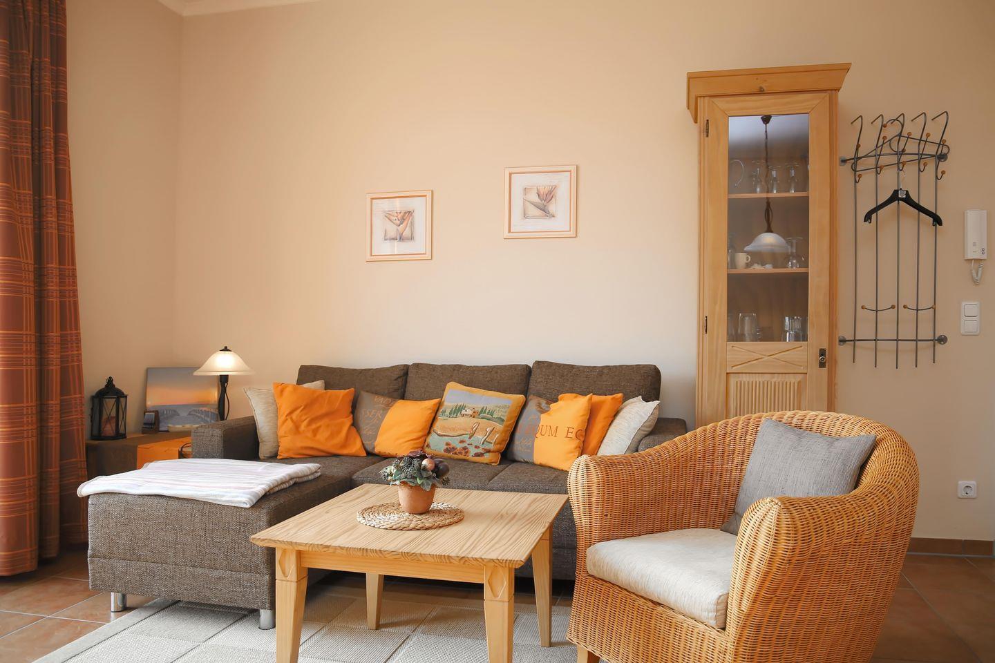 Der gemütliche Wohnbereich ist für dich mit einer Eckcouch, zwei Korbsesseln sowie einem Flachbild-TV, Blu-ray-Player und einer Stereoanlage eingerichtet. Genieße hier gesellige Abende. Der integrierte Essbereich bietet dir Platz für gemeinsame Mahlzeiten.
