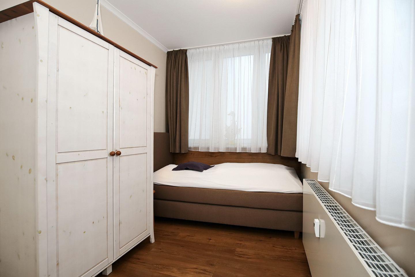Im Schlafzimmer der Ferienwohnung erwartet dich ein Boxspringbett (180 x 200 cm). Ein Kleiderschrank bietet dir Stauraum für dein Urlaubsgepäck. Das zweite Schlafzimmer ist für dich mit einem Boxspringbett (1 x 90 x 200 cm) und einem Klappbett (1 x 80 x 200 cm) eingerichtet. Vorhänge dienen dir als Sichtschutz und zum Verdunkeln.