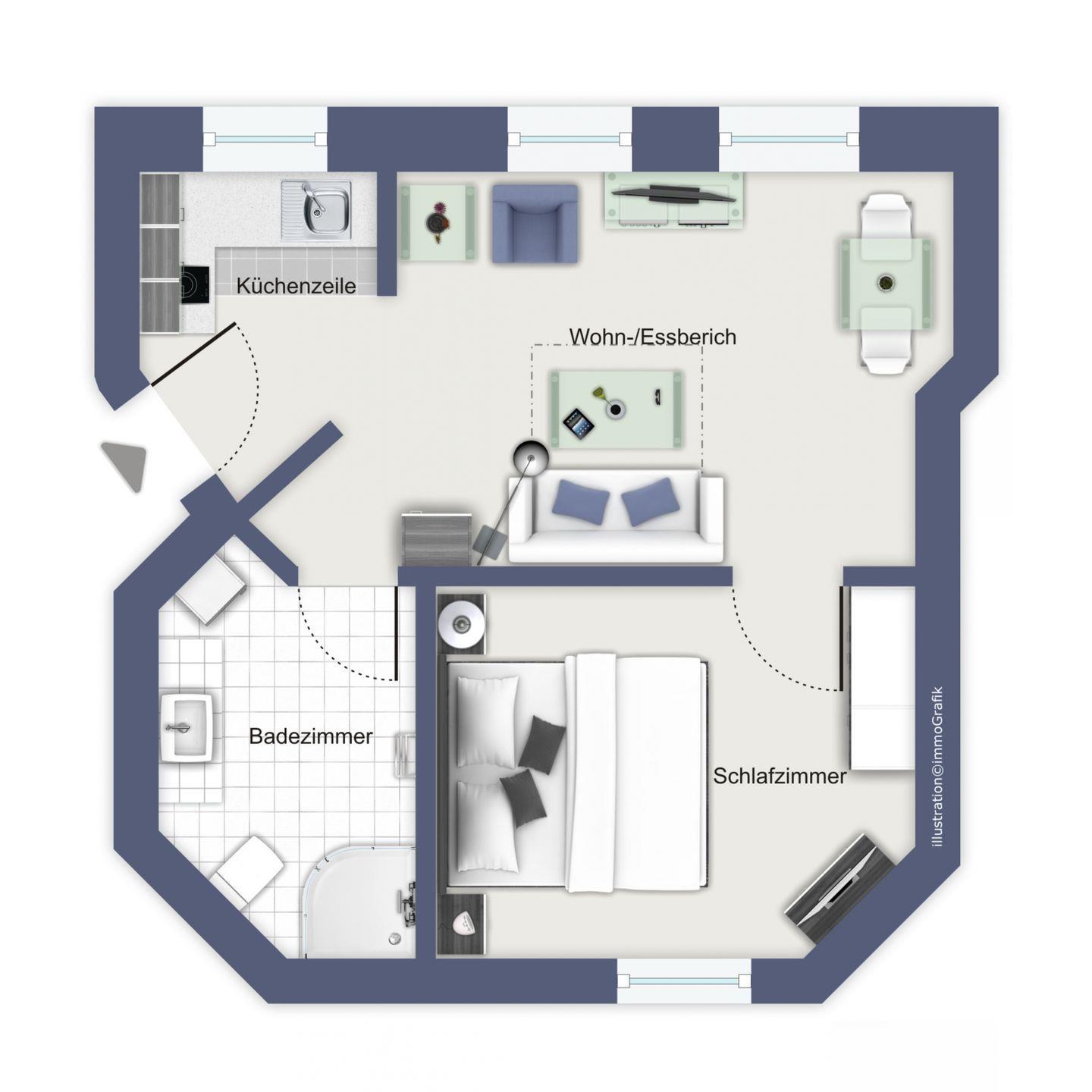 In der integrierten Küchenzeile stehen dir ein 2-Platten-Cerankochfeld, eine Mikrowelle, ein Kühlschrank mit Gefrierfach, eine Kaffeemaschine, ein Wasserkocher und ein Toaster zur Verfügung. Am Esstisch kannst du deine gemeinsamen Mahlzeiten in der Ferienwohnung genießen.