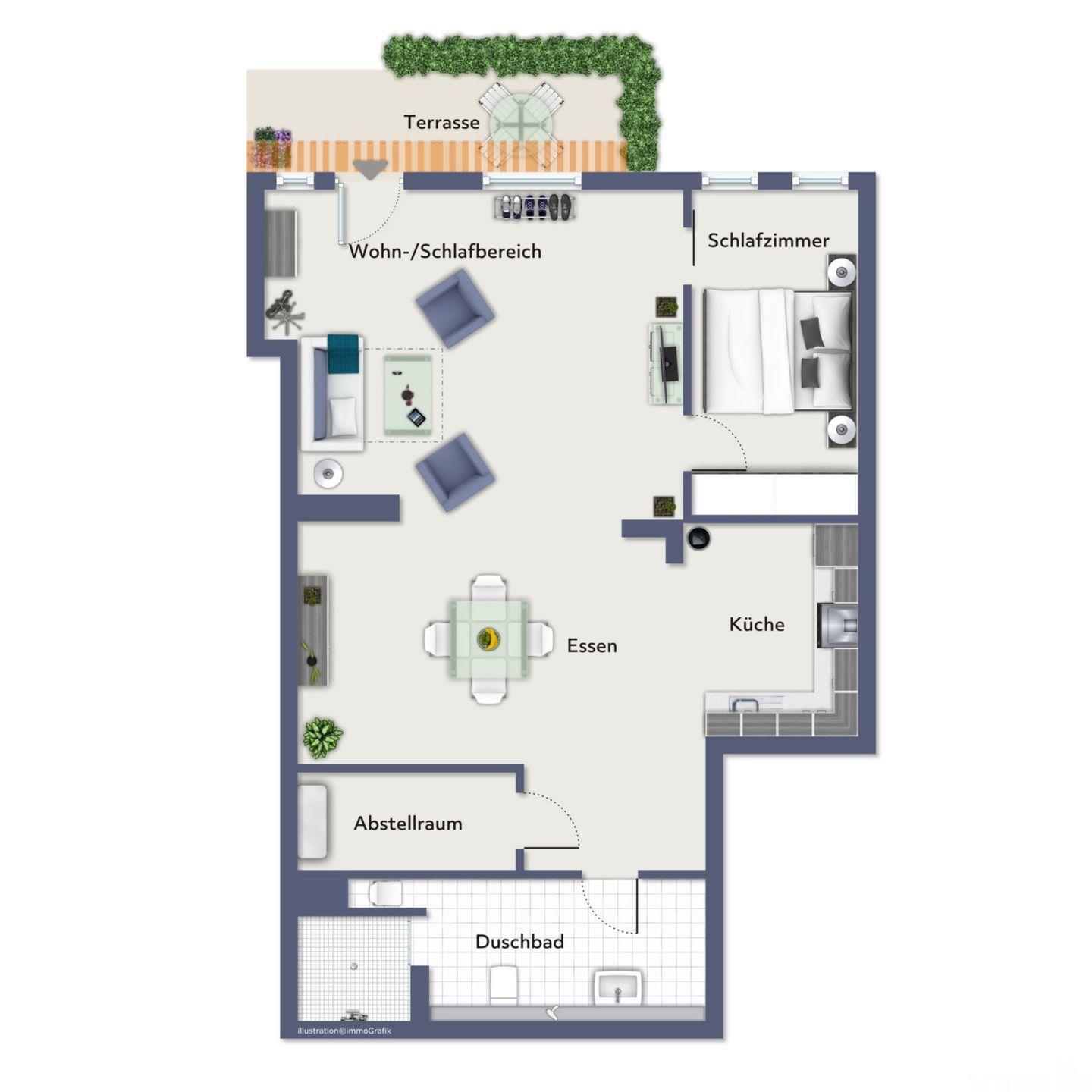 Die ca. 60 m² große Ferienwohnung liegt im Erdgeschoss. Es erwarten dich ein Wohn- und Essbereich mit einer großzügigen Küchenzeile und einem angrenzenden Abstellraum. Das Schlafzimmer und ein Duschbad komplettieren das Objekt.