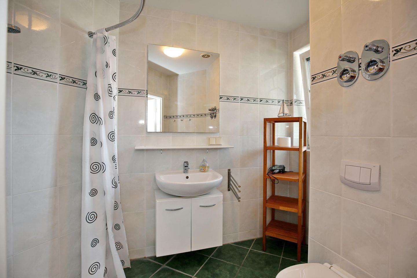 Das Badezimmer ist mit einer ebenerdigen Dusche, einem WC, einem Föhn und einem Regal für deine Utensilien ausgestattet. Als Bodenbelag wurde in der gesamten Wohnung Fliesenboden mit Fußbodenheizung verlegt.