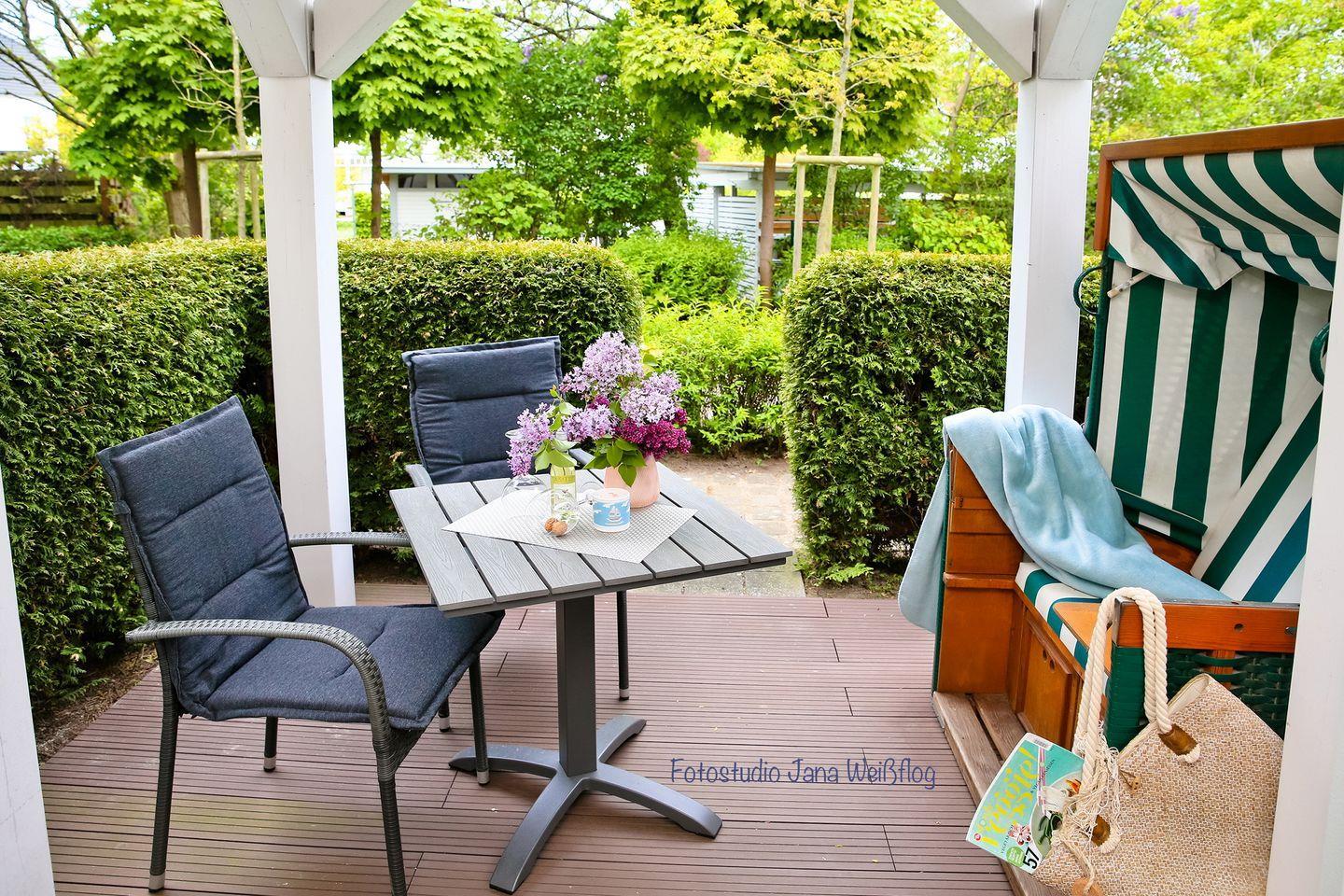 Der einladende Wohnbereich empfängt dich mit gemütlichen Sitzmöbeln. Zur Entspannung gibt es einen Flachbild-Fernseher. Durch die doppelflügelige Tür gelangst du von hier aus auf die überdachte Terrasse der Ferienwohnung. Des Weiteren steht dir kostenfreies WLAN zur Verfügung.