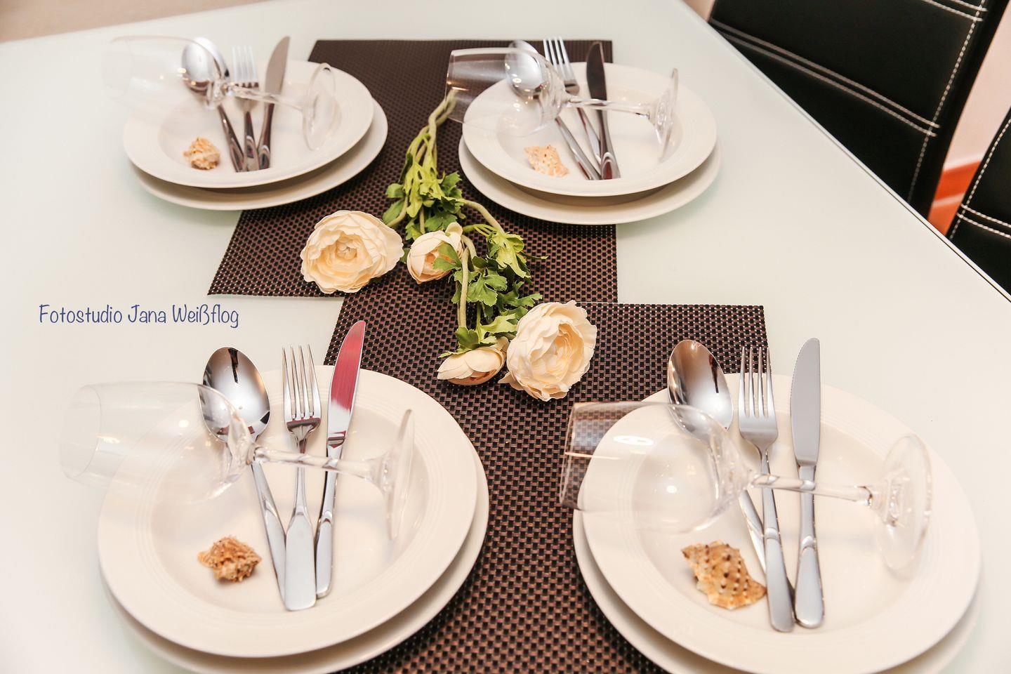 Die komplett eingerichtete Küchenzeile mit Cerankochfeld, Mikrowelle, Geschirrspüler und Kühlschrank ist in den Wohnbereich integriert. Eine Kaffeemaschine, ein Wasserkocher und ein Toaster sind selbstverständlich auch vorhanden. Am gegenüberliegenden Esstisch haben 4 Personen Platz.