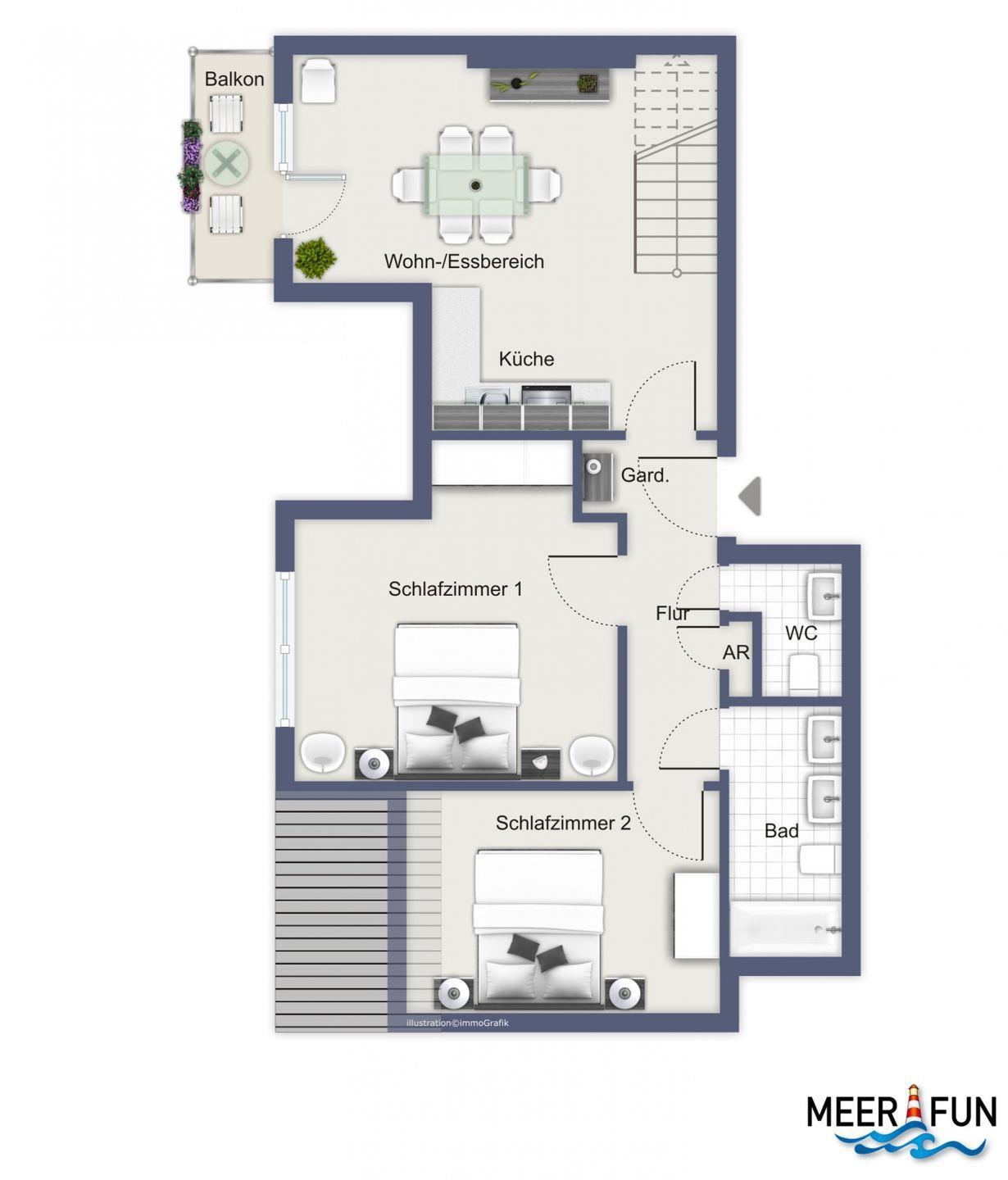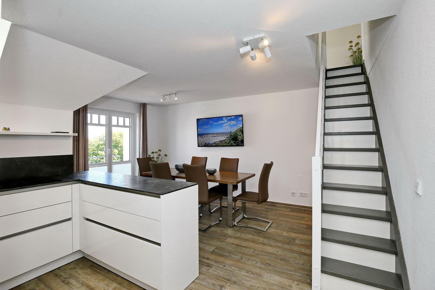 Die Ferienwohnung befindet sich im 3. Obergeschoss. Mit einer Größe von 99 m² erstreckt sie sich über 2 Etagen. Im unteren Bereich befinden sich ein Esszimmer mit angrenzender Küchenzeile, zwei Schlafzimmer, ein Duschbad und ein Gäste-WC. Im oberen Bereich stehen dir noch ein weiteres Schlafzimmer sowie der Wohnbereich zur Verfügung. Die Entfernung zum Strand beträgt etwa 100 Meter.
