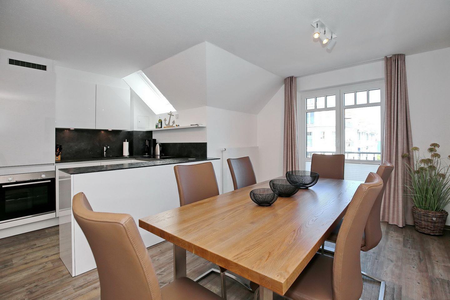 Im unteren Bereich erwartet dich ein großes Esszimmer mit einer Küche, diese ist mit einem Kühlschrank mit Gefrierfach, einem Geschirrspüler, einem 4-Platten-Cerankochfeld und einem Backofen ausgestattet. Vervollständigt wird die Ausstattung der Küche durch einen Toaster, einen Wasserkocher und eine Kaffeemaschine. Von hier aus geht es auf den zweiten Balkon zur Nordseite mit Meerblick.