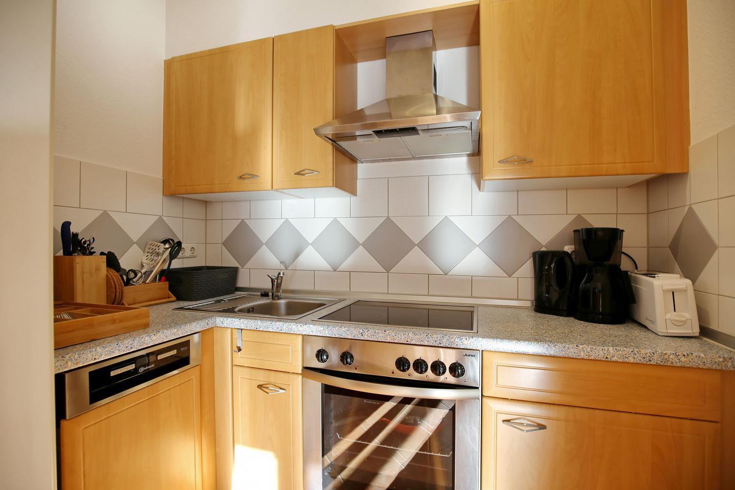 Die Küchenzeile ist für dich gut ausgestattet. Zur Kücheneinrichtung gehören ein Kühlschrank mit Gefrierfach, 4-Ceran-Kochfelder, Backofen, Geschirrspüler sowie Wasserkocher, Toaster und Kaffeemaschine.