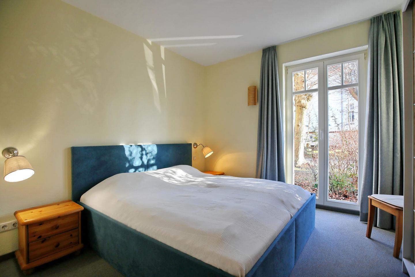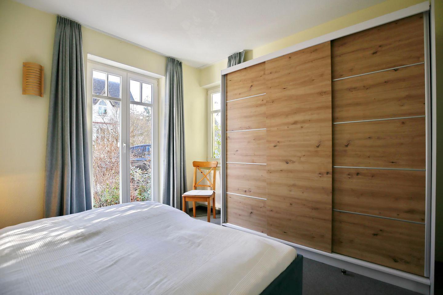 Im Schlafzimmer der Ferienwohnung erwarten dich ein Doppelbett mit zwei Matratzen (90 x 200 cm) und ein Kleiderschrank, der dir Stauraum für deine Urlaubskleidung bietet. Elektrische Rollläden dienen dir als Sichtschutz oder zum Verdunkeln.