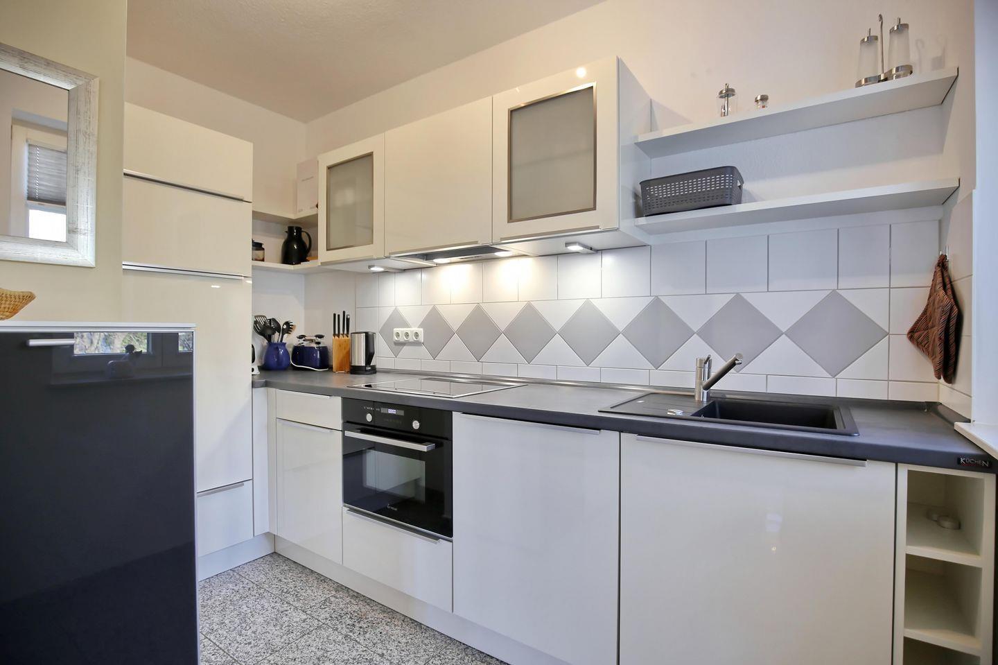 Die Küchenzeile ist für dich gut ausgestattet. Zur Kücheneinrichtung gehören ein Kühlschrank mit Gefrierfach, 4-Ceran-Kochfelder, Backofen, Geschirrspüler sowie Wasserkocher, Toaster und Kaffeemaschine.