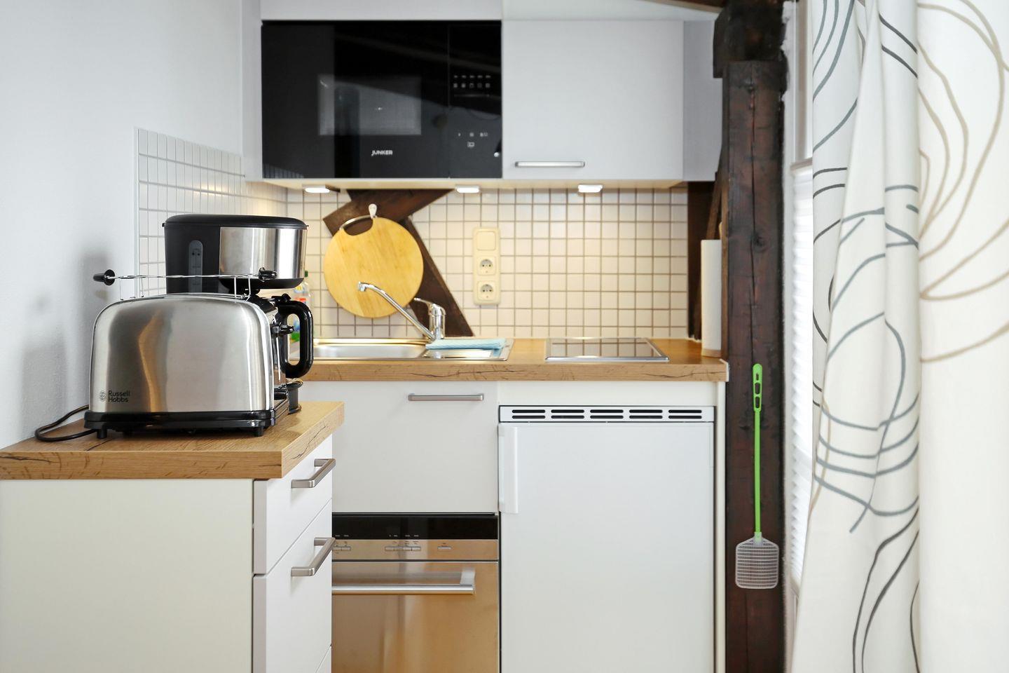 Die kleine Pantry-Küche der Ferienwohnung ist mit einem Kühlschrank mit Gefrierfach, einem 2-Platten-Cerankochfeld, einem kleinen Geschirrspüler, einer Mikrowelle mit Grill sowie einem Toaster und einer Kaffeemaschine gut ausgestattet. Von der Küche aus gelangst du auf den großzügigen Balkon. Genieße hier die Ruhe und die frische Ostseeluft.