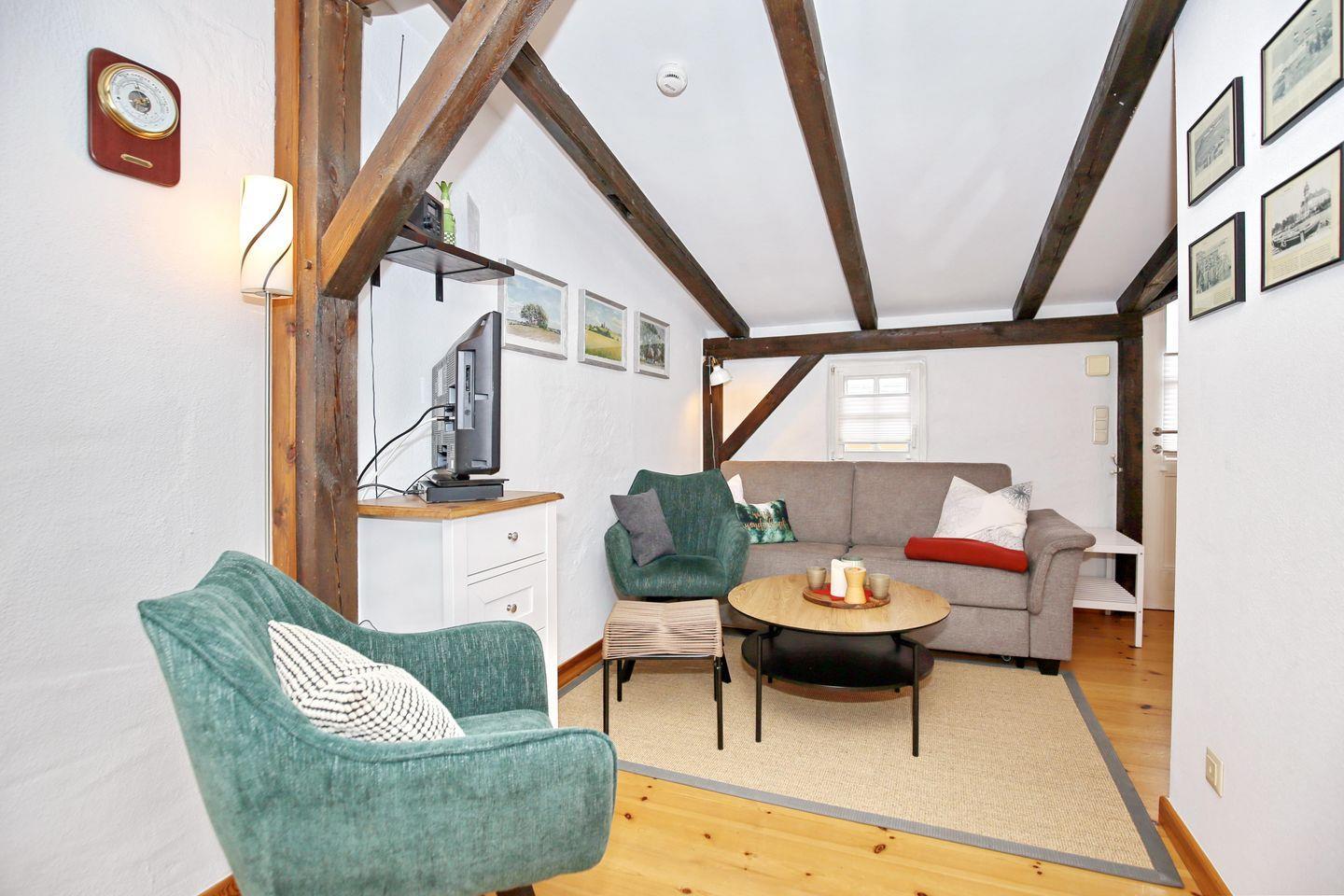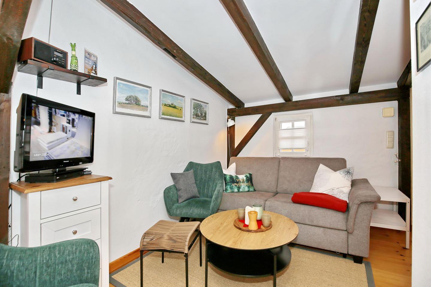 Der Wohnbereich ist mit einer Couch (140x200cm), zwei Sesseln, einer Kommode, einem Blu-Ray-Player und einem Flachbild-TV eingerichtet. Der gemütliche Essbereich lädt zu gemeinsamen Mahlzeiten ein.