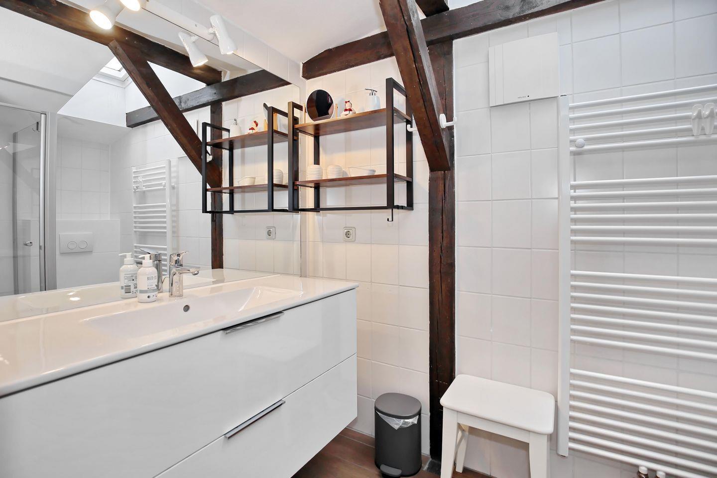 Das geflieste Tageslichtbad mit WC und Dusche verfügt über einen Doppelwaschtisch mit Ablagefläche. Ein großer Spiegel sowie ein kleines Regal und ein Föhn komplettieren die Ausstattung des Bades. Im Wohn- und Küchenbereich sind Holzdielen und im Schlafzimmer ist Teppichboden verlegt.