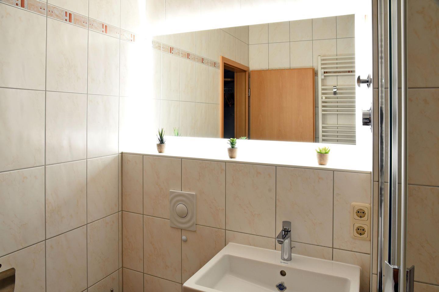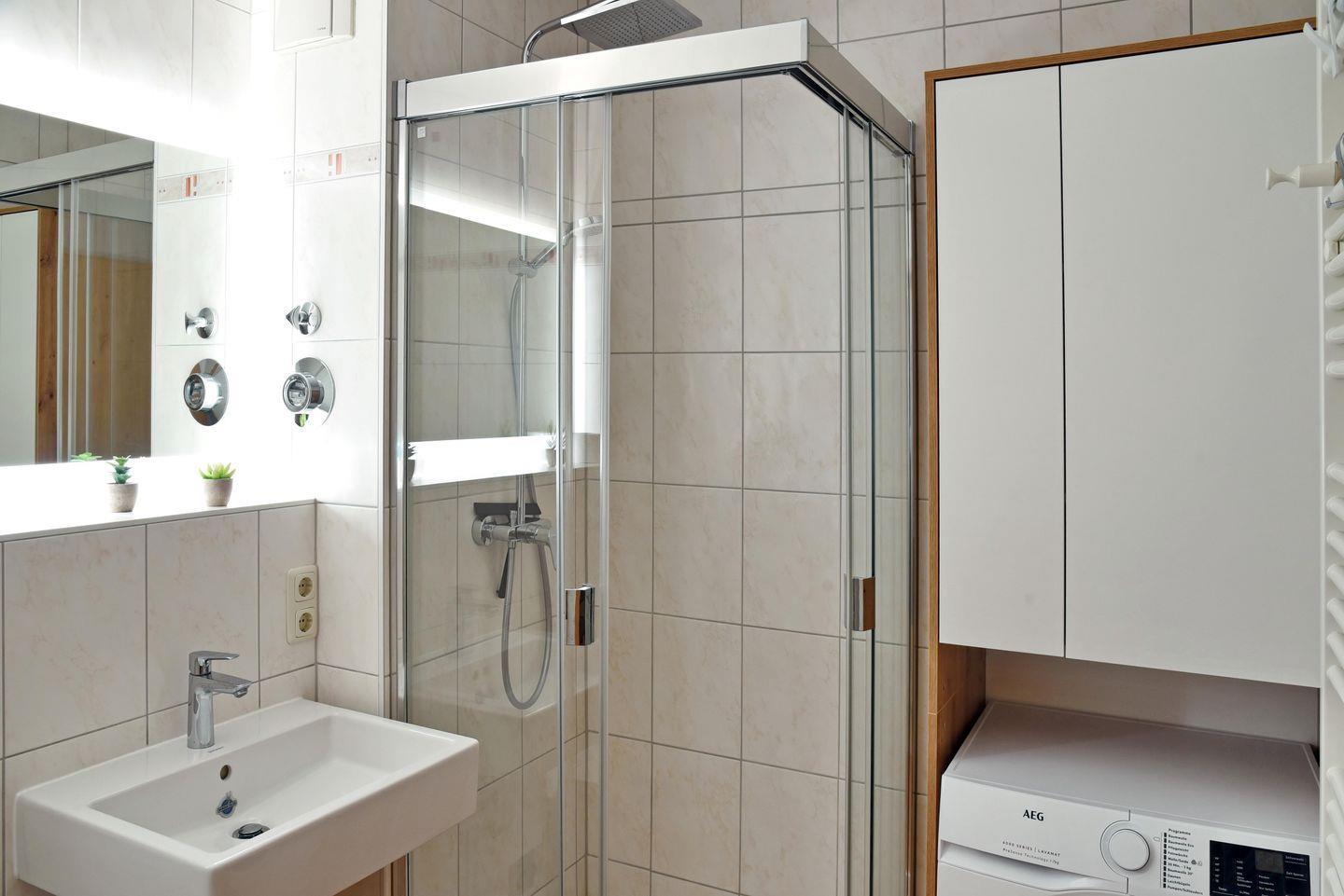 Das großzügige Bad ist gefliest und verfügt über ein Waschbecken, eine Dusche, eine Waschmaschine und einen Fön. Zum Trocknen der Wäsche steht ein Wäscheständer bereit.