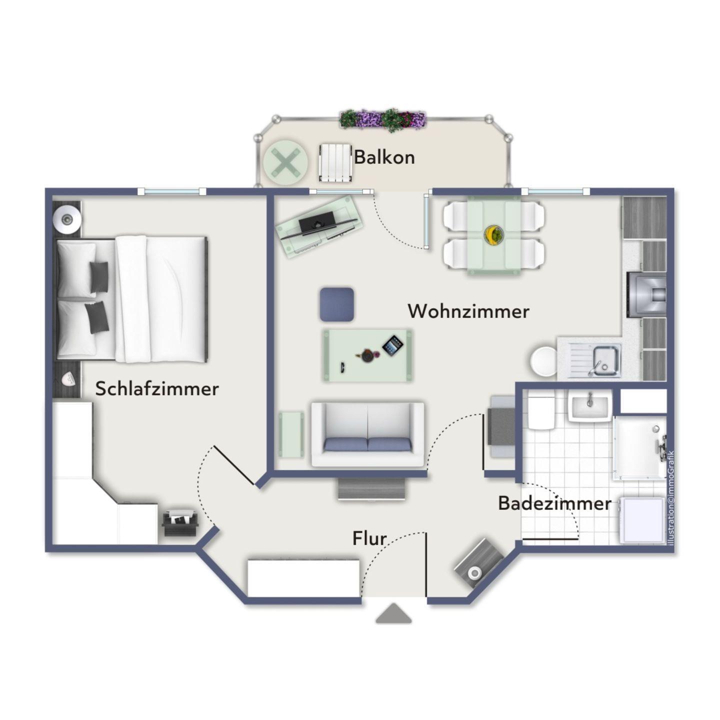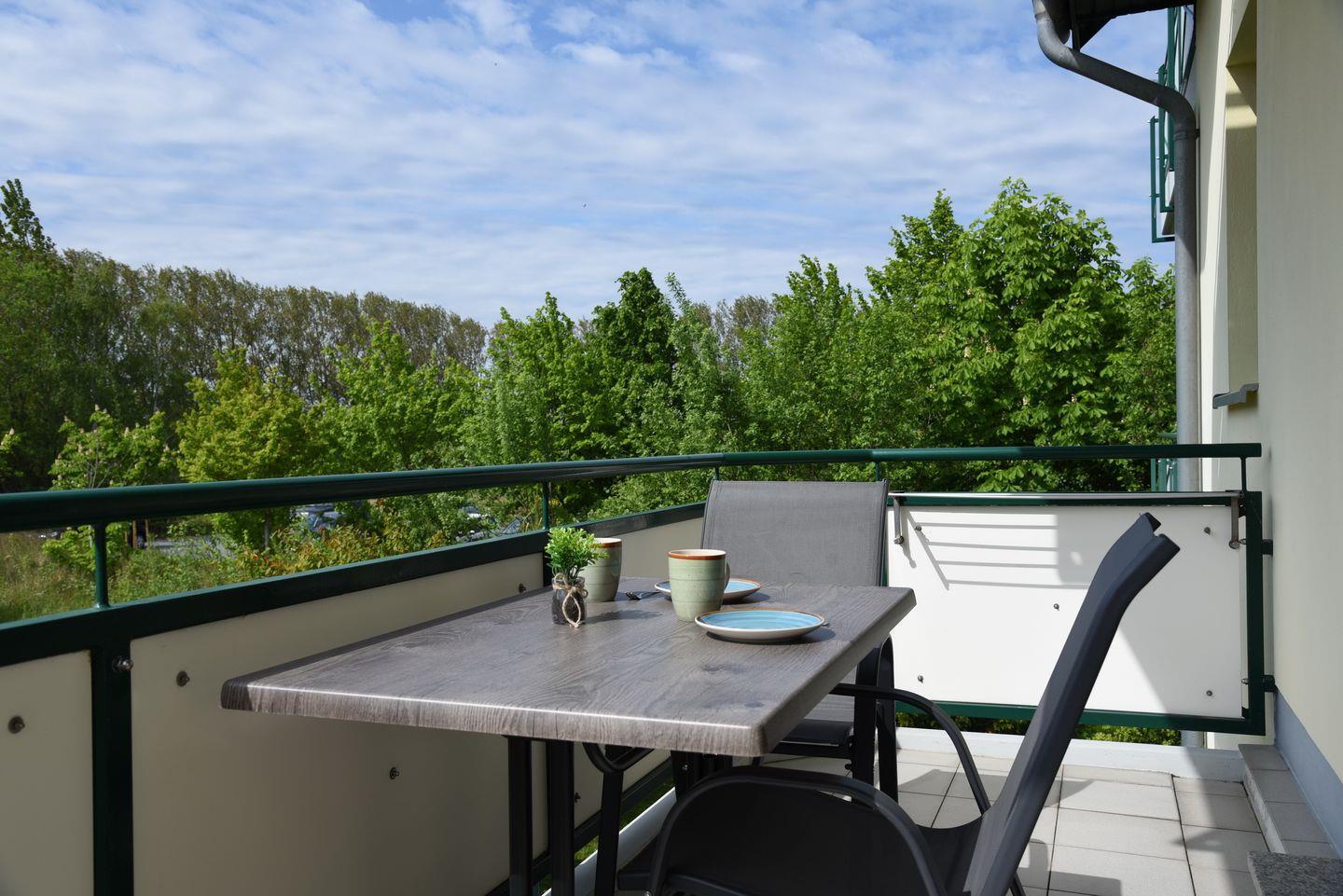 Der Wohnbereich ist mit einer Doppel-Schlafcouch, einem Radio/CD-Player und einem Flachbild-TV gut ausgestattet. Vom Wohnzimmer gelangst du direkt auf den Balkon mit Süd-Ausrichtung.
