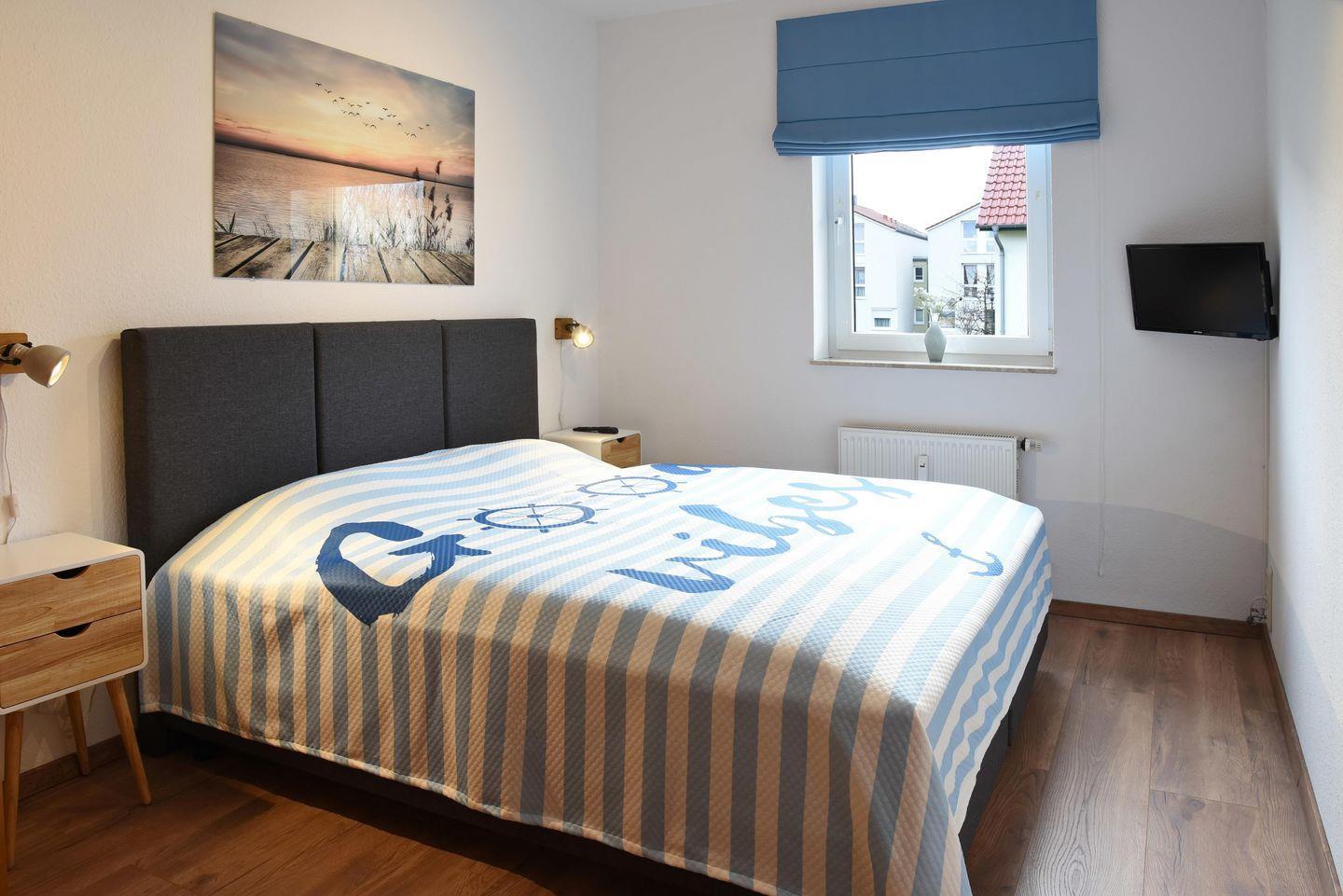 Für dein Wohlbefinden sorgt im Schlafzimmer der Ferienwohnung ein Doppelbett (180 x 200 cm), ein Flachbild-TV und ein geräumiger Kleiderschrank, in dem du deine Bekleidung verstauen kannst. Der Boden wurde mit Laminat ausgelegt. Für 2 weitere Personen steht im Wohnbereich eine Schlafcouch (160 x 200 cm) zur Verfügung.