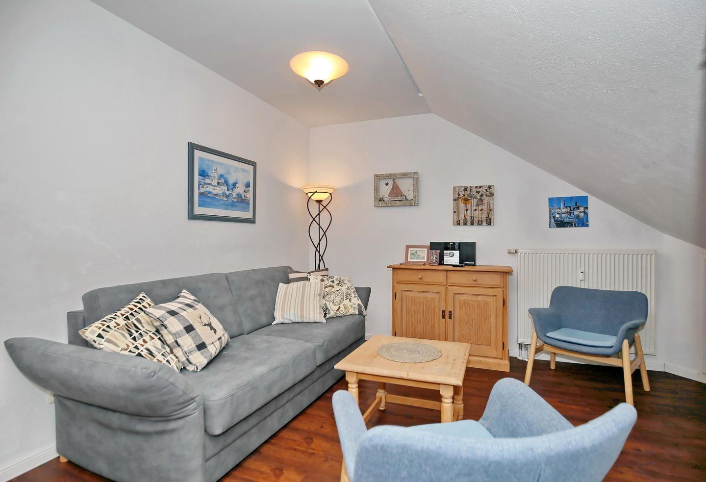 Im Wohnbereich der Ferienwohnung laden dich ein gemütliches Doppelschlafsofa (130 x 200 cm), zwei Korbstühle und ein Flachbild-TV zu schönen Fernsehabenden ein. Neben einem DVD-Player stehen dir auch ein CD-Radio zur Verfügung.