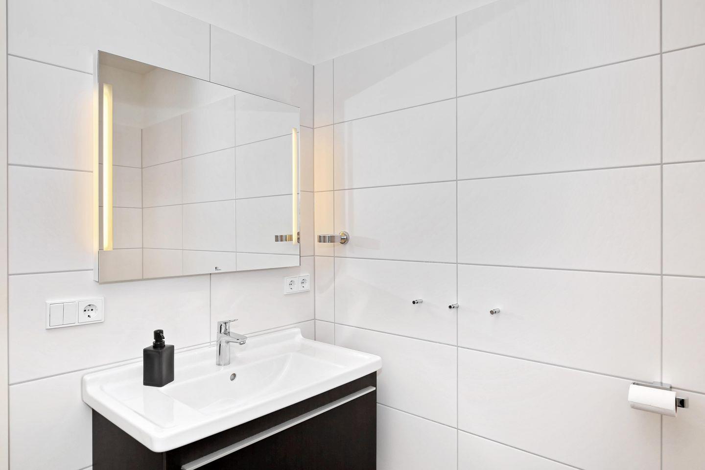 Das Bad verfügt über eine Dusche und ein WC und ist zusätzlich mit einem Föhn ausgestattet. Der Einstieg in die Dusche ist barrierearm.