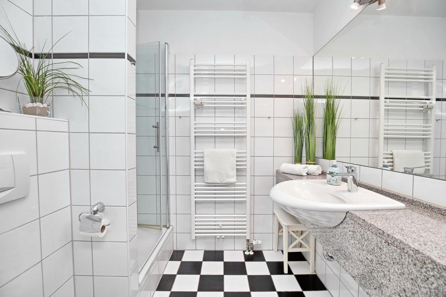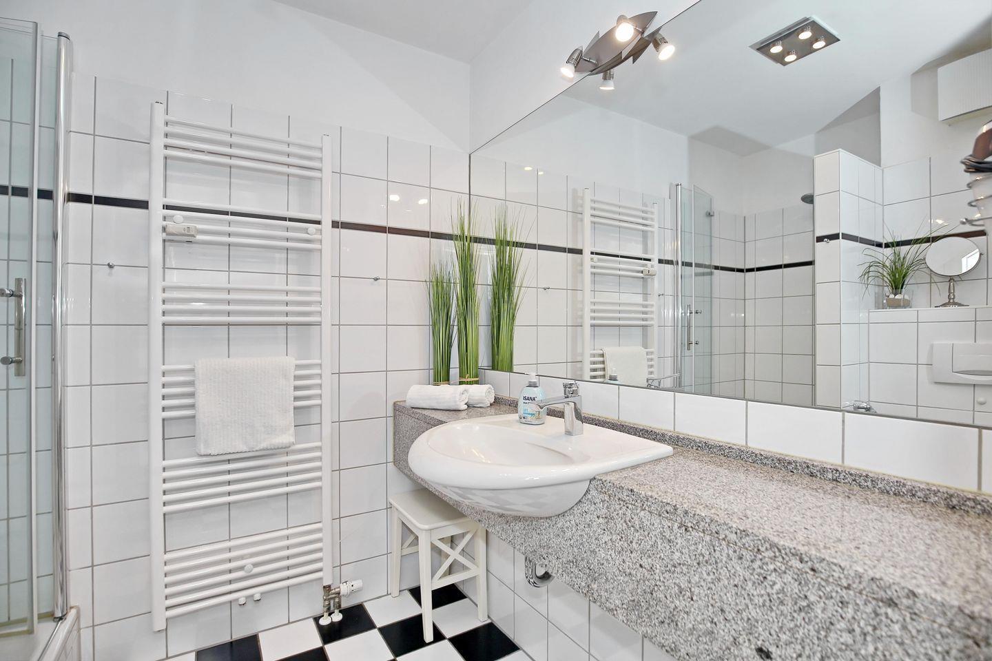 Die Ferienwohnung verfügt über ein gefliestes Duschbad mit WC. Für deine Waschutensilien findest du genügend Platz auf dem großzügigen Waschtisch. Ein Föhn komplettiert die Ausstattung des Bades. Im Wohn- und Schlafzimmer wurde Design-Belag verlegt. In dieser Nichtraucherwohnung sind Haustiere nicht erlaubt.