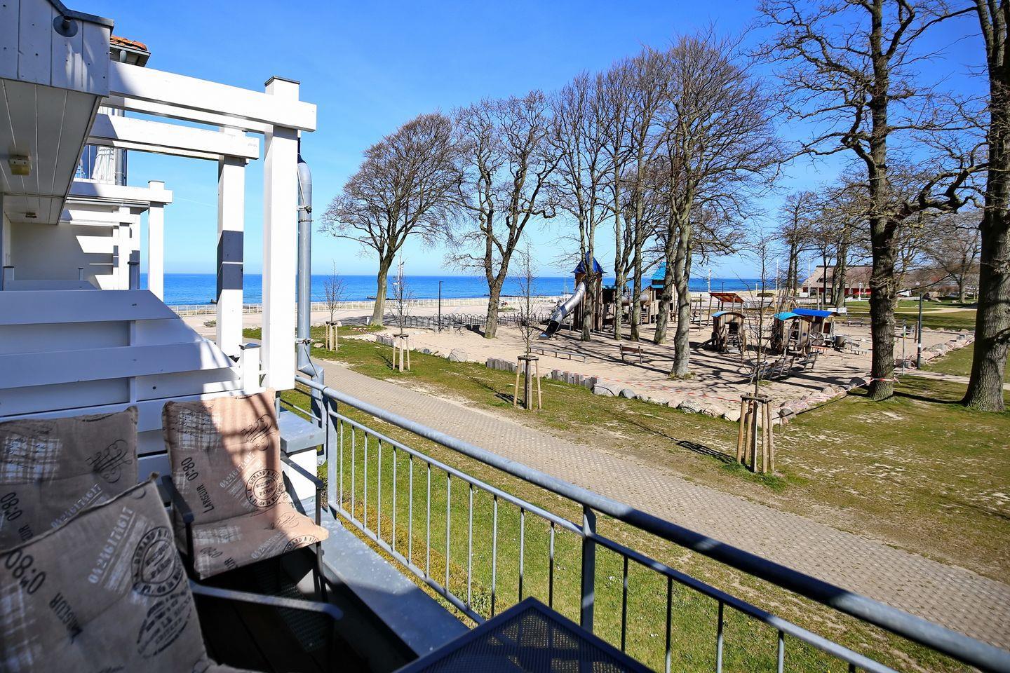 Die Ferienwohnung Nr. 104 im Haus Meeresblick ist eine 2-Zimmer-Wohnung im 1. OG mit einer Größe von etwa 54 m². Vom Balkon, haben Sie einen herrlichen Teilseeblick auf die Ostsee.
